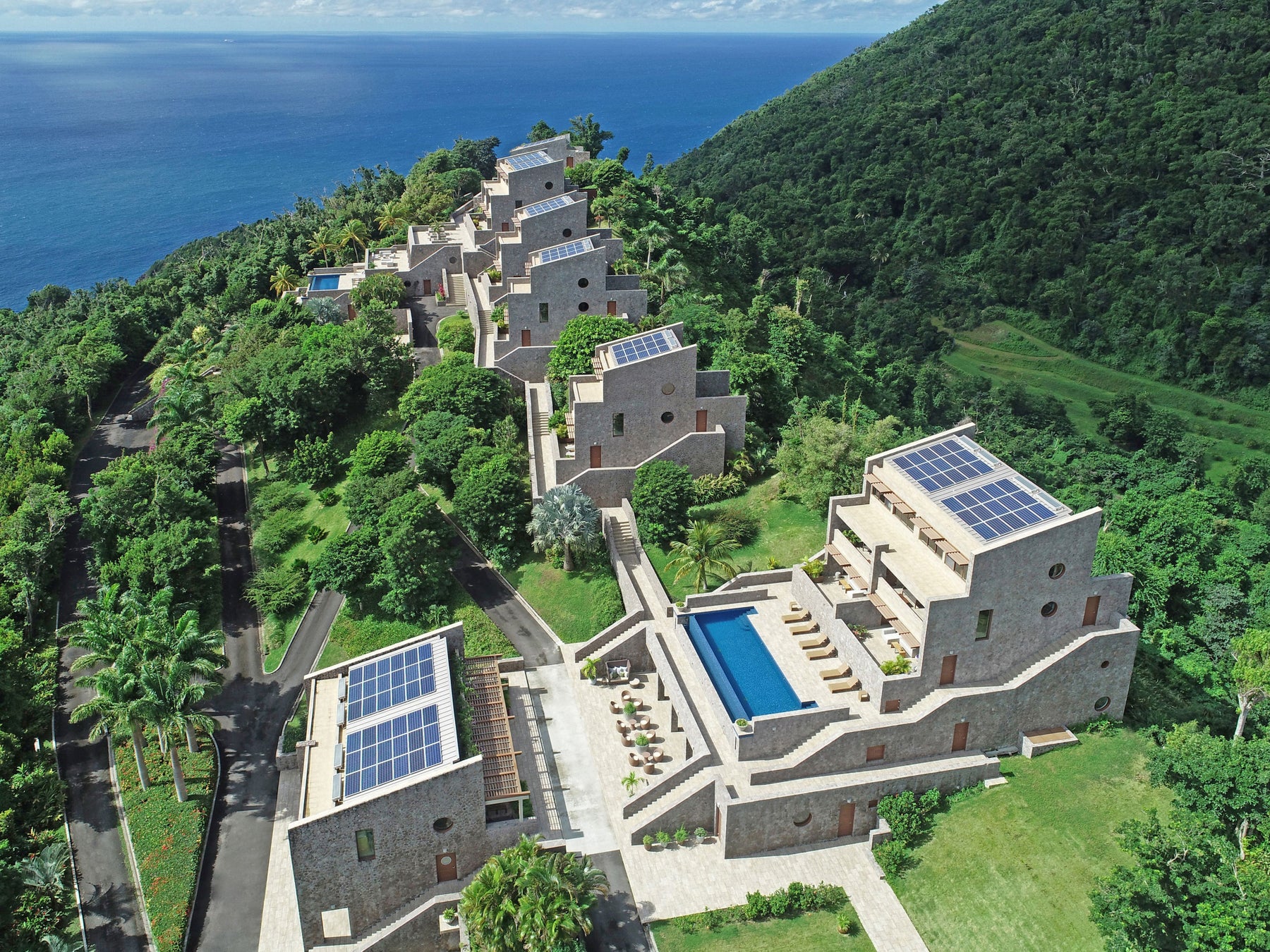 クーリブリー・リッジは、14のスイートを備えた贅沢な隠れ家ホテルで、地域社会との密接な結びつきを大切にしながら、モダンで自給自足型のエコリゾートをどのように尊重して開発・運営するかという長期的な研究プロジェクトとして設計されました。ドミニカ南部の山の尾根に位置するこのリゾートは、太陽光、風、雨を活用し、他では味わえない独特の島体験を提供していす。ユニークな屋根デザインにより集められた雨水は、紫外線と銅のイオン化技術で浄化され、ゲストスイートと6つの塩素フリーのプールに供給されます。また、排水システムは熱帯庭園の灌漑用水として中水を再利用しています。内装には再利用されたチーク材を使用し、天井にはリサイクル可能でカビに強いアルミニウムを採用しています。リゾートの外装は現地で調達した手彫りの石材と地元の職人によって作られ、ハリケーンや地震、湿気に耐え、自然環境と一体化するように設計されています。