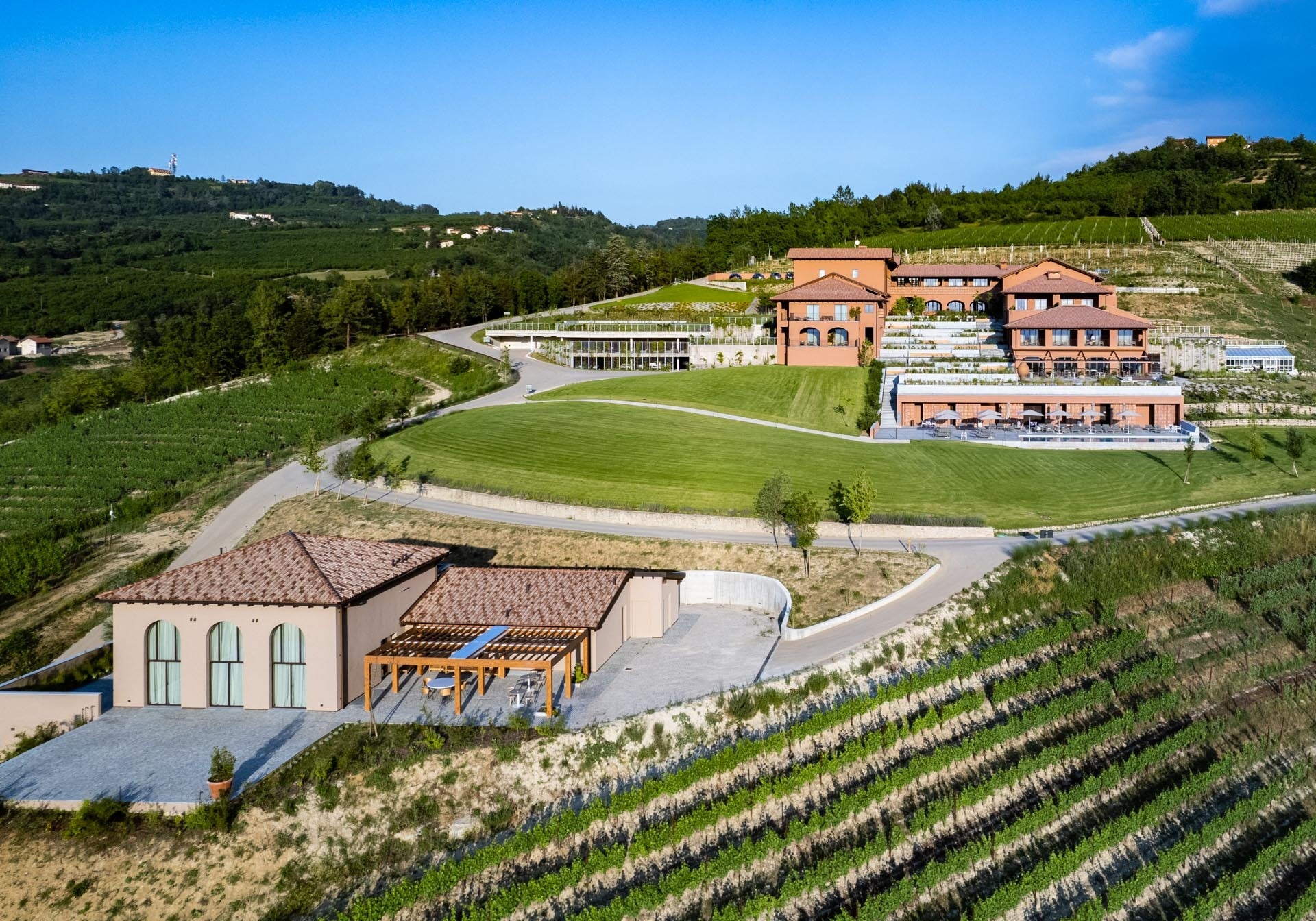 イタリアン アルプスの麓に位置するカーサ・ディ・ランガは、森とブドウ畑に囲まれ、自然の景観とこの地域のワイン造りの伝統を尊重したデザインとなっています。リゾートの建築とインテリアは、地元ピエモンテの職人の手によるもので、ルセルナ石やリサイクル可能なテラコッタなどの現地の素材が使用され、環境と調和しています。内装は、ヴィンテージ要素とリサイクル素材を使った特注の家具を組み合わせています。また、地元の生態系を保護し、生物多様性を高めるため、再生可能なガーデニング技術を採用しています。