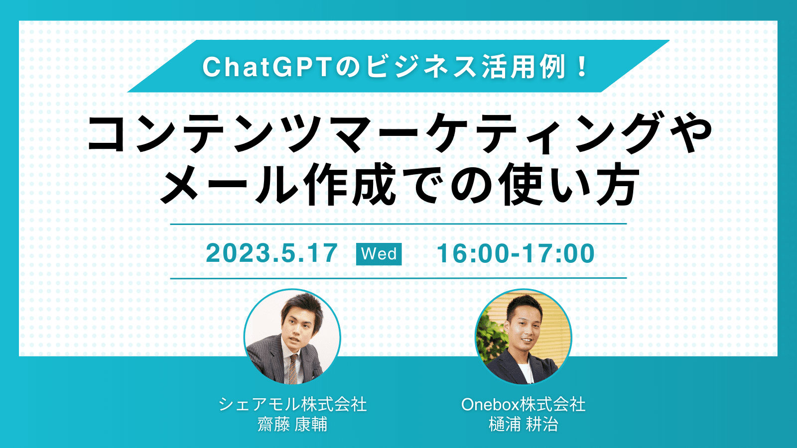 シェアモル株式会社(本社:東京都墨田区、 代表取締役:齋藤 康輔)は、2023年5月17日、ChatGPTのビジネス活用例!コンテンツマーケティングやメール作成での使い方というタイトルで共催ウェビナーを開催いたします。