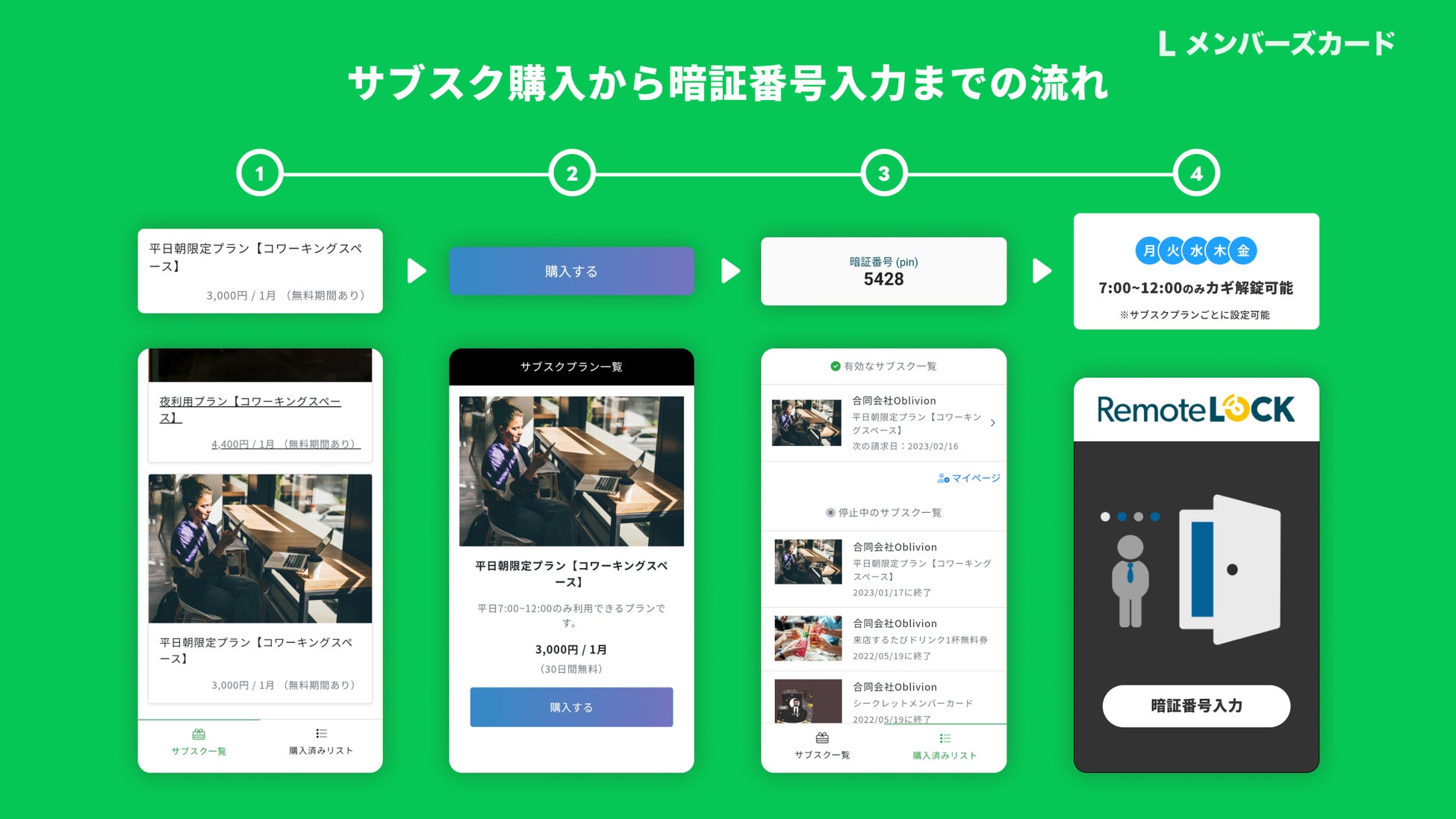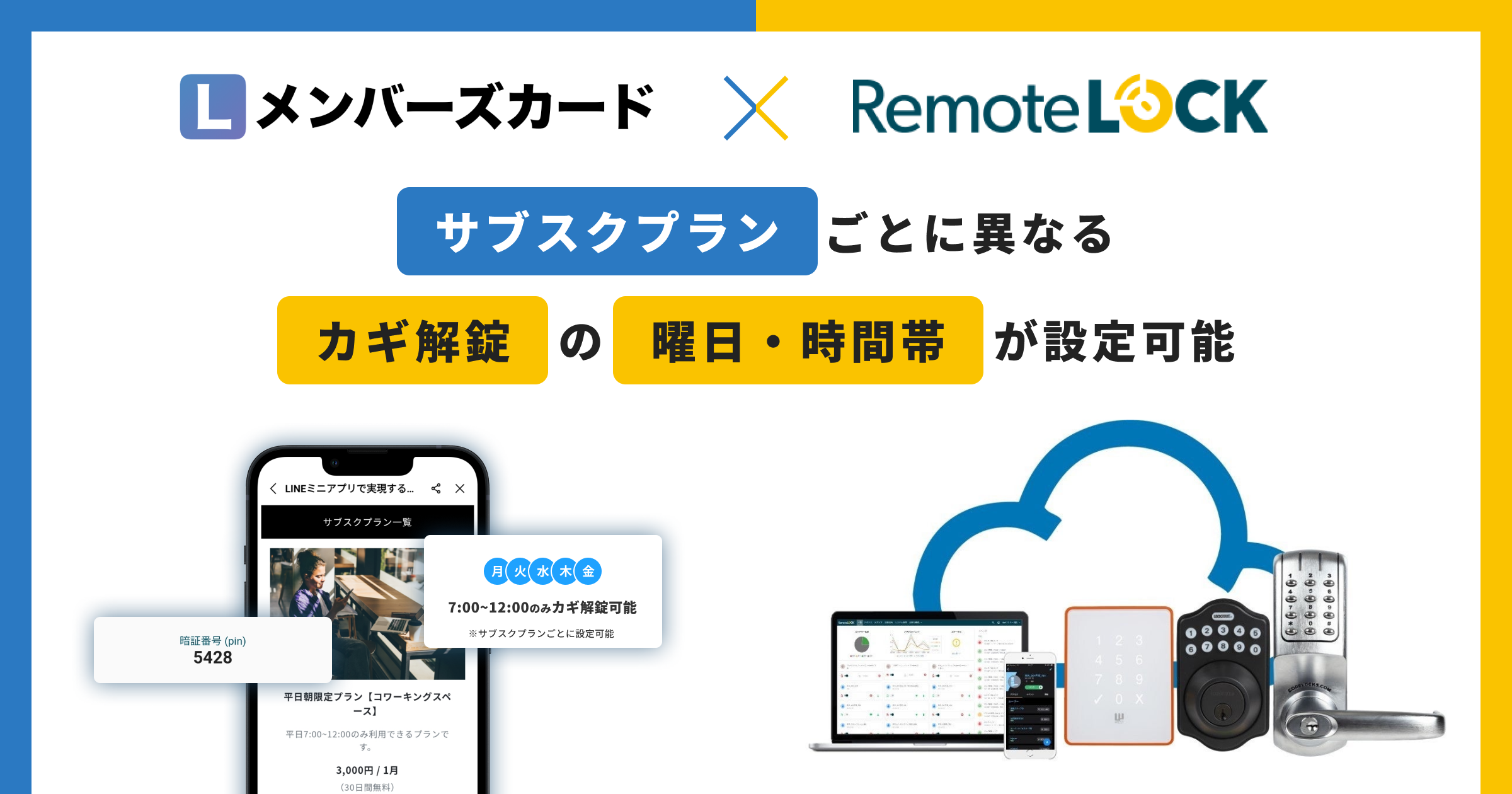 合同会社Oblivion(所在地:東京都千代田区平河町1-6-15、代表取締役社長:佐藤日出輝)が提供するLINEデジタル会員証システム『Lメンバーズカード』のサブスク機能が、クラウド管理機能を備えたスマートロック「RemoteLOCK(リモートロック)」との連携を開始いたしました。本連携により、サブスクプランごとに入室できる曜日・時間帯が設定可能になり、設定に合わせてRemoteLOCKのカギ解錠権限が与えられます。施設運営の省人化・無人化やオペレーションコスト削減といった店舗DXを強力に促進します。