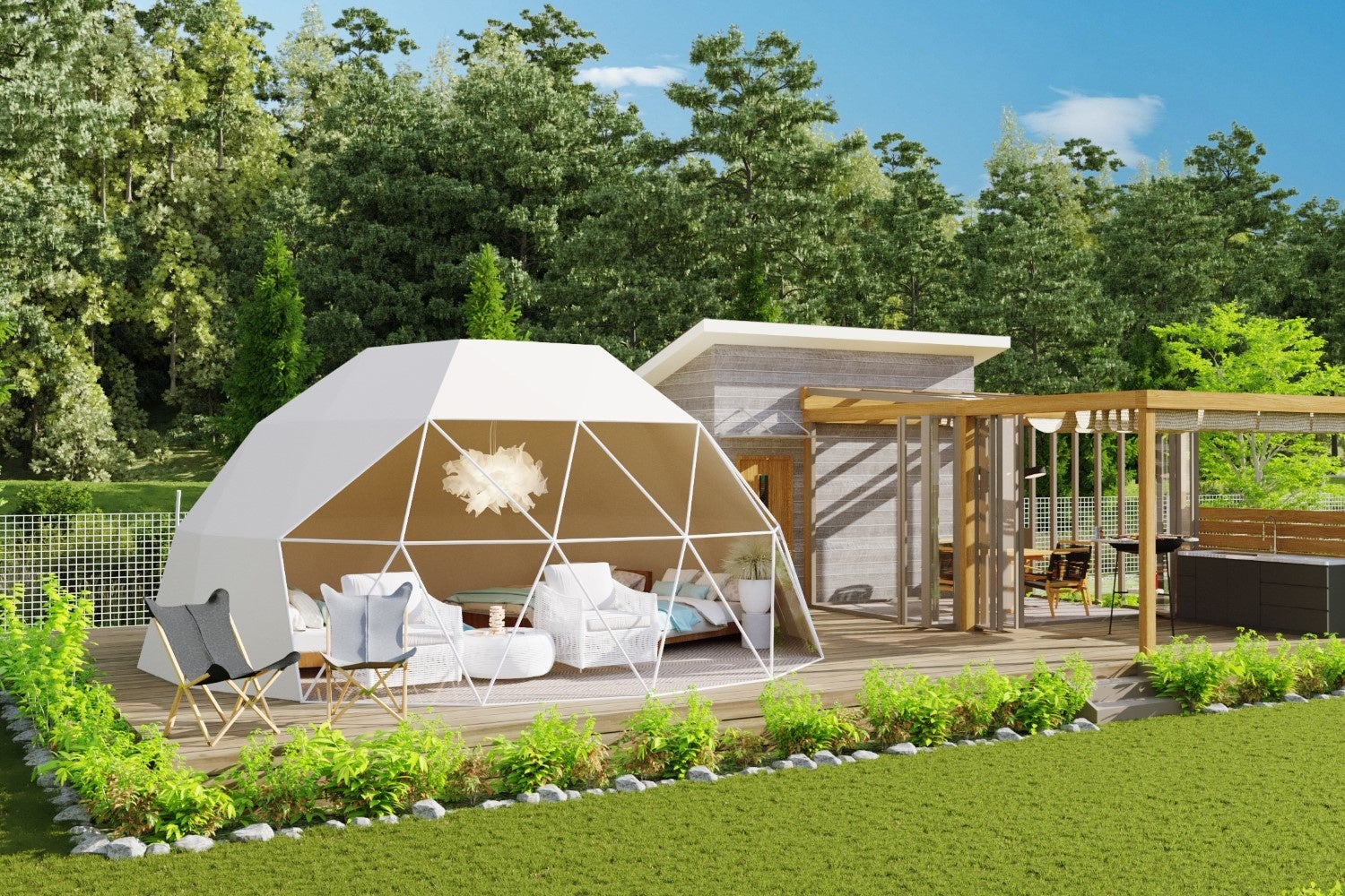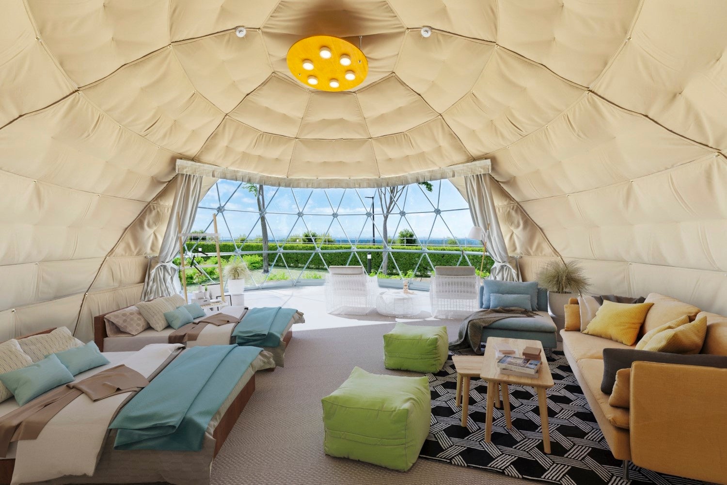 中が2重構造になっており、一般的なテントと比較して優れた断熱性があり、外気温の影響を受けにくく、また全客室内にエアコンを完備し、オールシーズン快適にお過ごしいただけます。全10棟、うち4棟は愛犬同伴可能なプライベートドッグラン付き。また各ドームすぐ側に専用BBQスペース、シャワールームやトイレも備えており、完全プライべートスペースにてお過ごしいただけます。