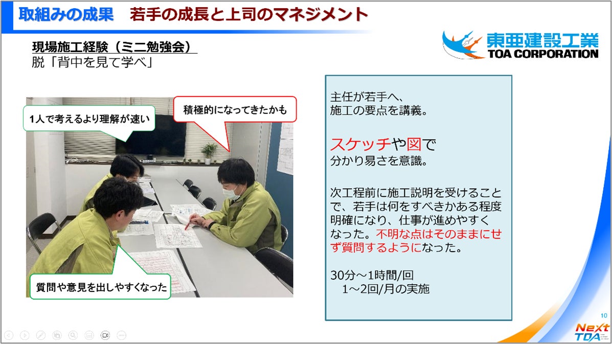 約8か月間のサポートの中で、現場毎に「ありたい姿」を共有し、増やしたい時間・減らしたい時間に対して解決策を議論して実行、その成果を振り返るサイクルを繰り返した結果、現場全員のコミュニケーションが密になり心理的安全性が向上してきたことや、新人社員のスキルアップや担当業務量の増加、指導社員の時間余裕が生まれ取り組む仕事がランクアップ、主任クラスによる勉強会で「背中で語る」のではなくフォローを手厚くでき、より早く自分の仕事を任せるきっかけになった、という事例などを紹介いただきました。