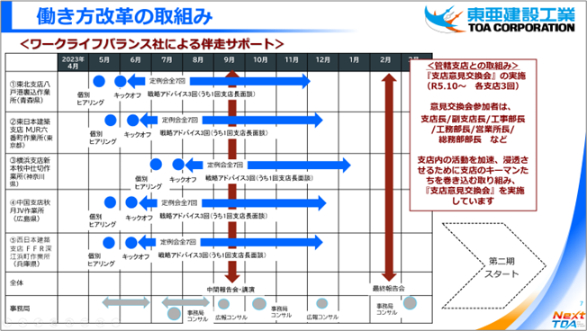2018年以降様々な取組みを行ってきたものの、依然として人材不足・事業量の確保・残業時間の削減といった課題があり、WLB社の「カエル会議」を2023年2月から試験的に、2023年4月より5支店5現場で本格導入を開始しました。