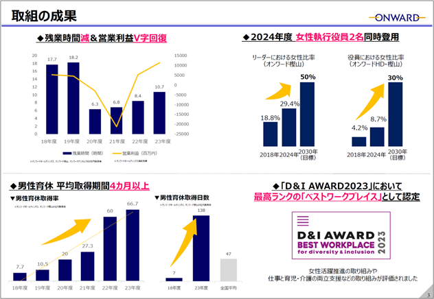 かつては残業や休日出勤が多く、上意下達の文化だったところから、多様で個性的な人財が活躍できる企業へと進化する「ONWARD VISION2030」を掲げて、2019年から当社とともに様々な施策を展開しています。働き方デザインの結果、これまでに残業時間減・営業利益V字回復、2024年度女性執行役員2名同時登用、男性育児休業の平均取得期間4か月以上の達成、「D&I AWARD2023」で最高ランク「ベストワークプレイス」を受賞などの様々な成果を創出してきました。
