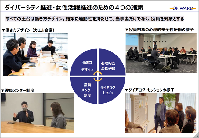特に、ダイバーシティ推進・女性活躍推進のための4つの施策として、カエル会議、役員対象の心理的安全性研修、役員メンター制度、社長と女性役員候補との対話の場である「ダイアログ・セッション」など当社が支援した取組みが一定の効果を持ったことも紹介いただきました。