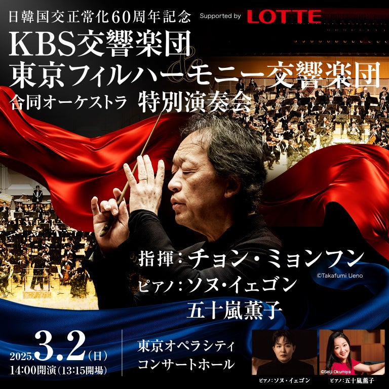 公益財団法人 東京フィルハーモニー交響楽団(以下、東京フィル/所在地:東京都新宿区/理事長:三木谷浩史)は、2025年3月にこの節目を記念し、韓国を代表するオーケストラKBS交響楽団と両国を代表する若き才能をソリストに迎え、東京とソウルの2都市で合同オーケストラによる特別演奏会を開催します(特別協賛:株式会社ロッテホールディングス)。