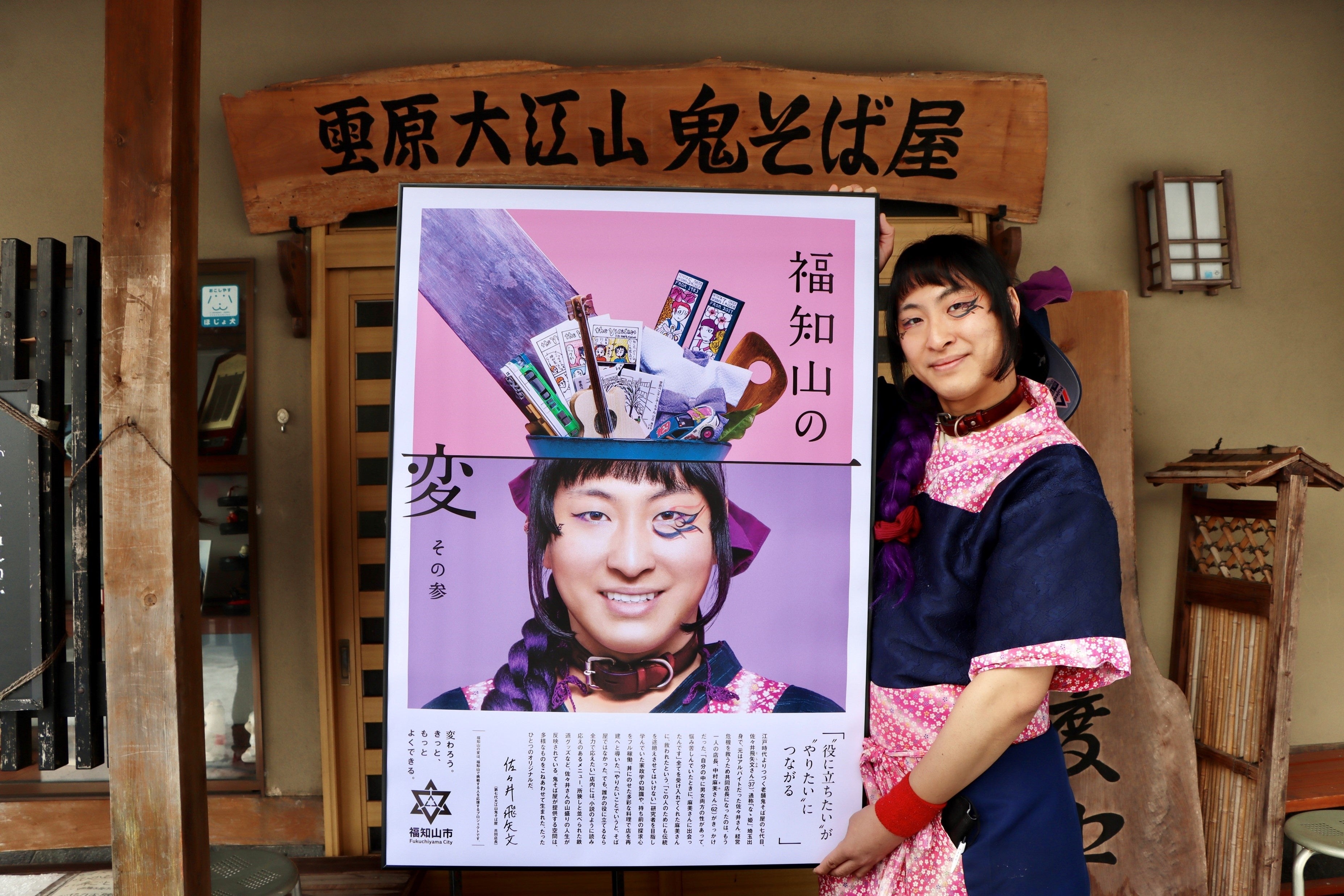 今回の“変化人”は、江戸時代から続く老舗「大江山鬼そば屋」の七代目(第七代共同店長)で、移住者の「なゝ姫(ななひめ)」こと佐々井飛矢文(ささいとしふみ)さん。佐々井さんが継いだそば店は、鬼伝説で有名な大江山のふもとにあり、名物は「鬼そば」。そこで鬼つながりで、「02(オニ)」の語呂合わせから福知山市が「鬼鬼の日」と名付けた2月2日のお披露目となりました。