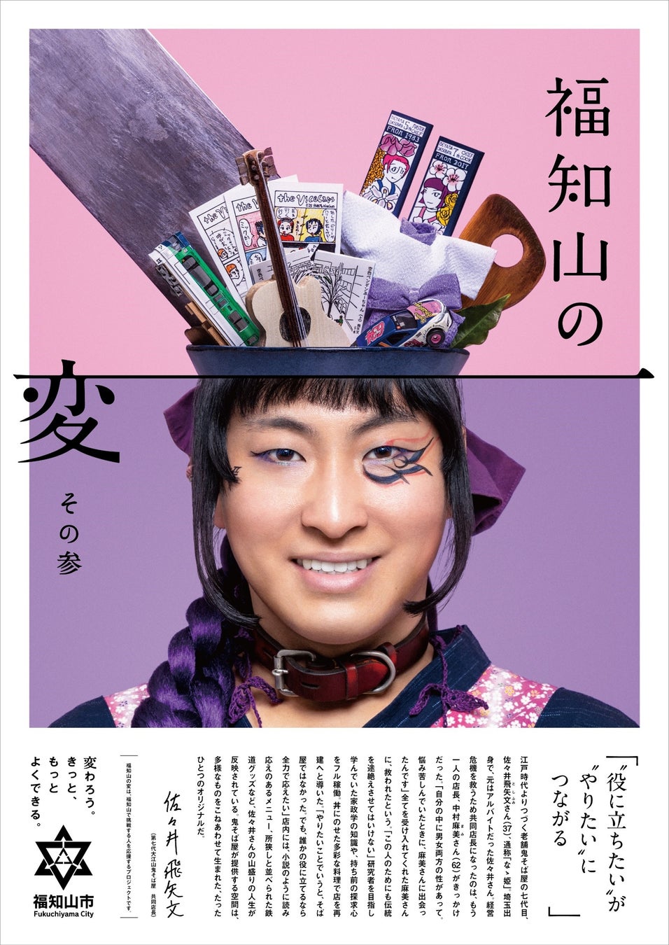 「福知山の変」のビジュアルは、“変化人”の頭の中を表しています。今回は、佐々井さんが考案し、経営危機の鬼そば屋を復活に導いた人気メニュー「山盛りの天ぷらが乗った鬼そば」から着想し、天ぷらの代わりに、そば切り包丁や木べら、また多趣味な佐々井さんらしく電車、小説、音楽、洋服、車などご本人手作りのオブジェが詰め込まれたモチーフになりました。衣装やメイクは、佐々井さんが普段働く姿で撮影。そして「“役に立ちたい”が“やりたい”につながる」と題し、もうひとりの店長・中村麻美(まみ)さんとともに、自分らしく挑戦しながら伝統をつなぐ佐々井さんのストーリーを掲載しています。