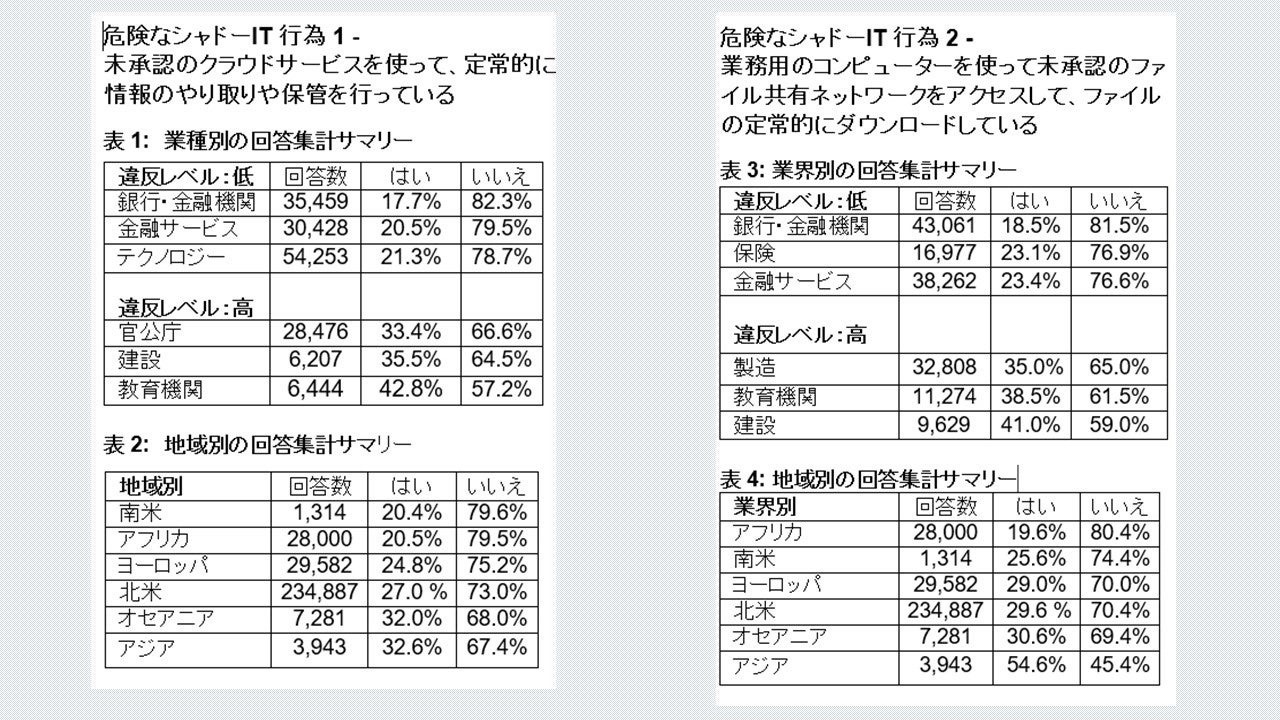 この調査レポートは、世界の地域と業種を問わず43万5千人を超える回答者からの調査回答をもとに、シャドーITとして常態化しつつある2つの危険な行為について分析したものです。1つ目の危険な行為として、「業務目的での情報のやり取りや保管に未承認のクラウドサービスを利用しているか」が、分析対象となりした。2つ目は、「業務用のコンピューターを使って未承認のファイル共有ネットワークをアクセスして、ファイルのダウンロードしていないか」が、分析対象になりました。