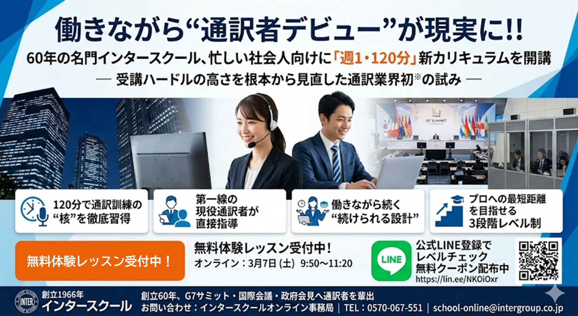創立60年、G7サミットをはじめ政府会見・国際会議の現場で活躍する通訳者を多数輩出してきたインタースクール(株式会社インターグループ)は、忙しい社会人でも実務レベルの通訳力を習得できる「会議通訳科 本科・週1コース」を新設しました。