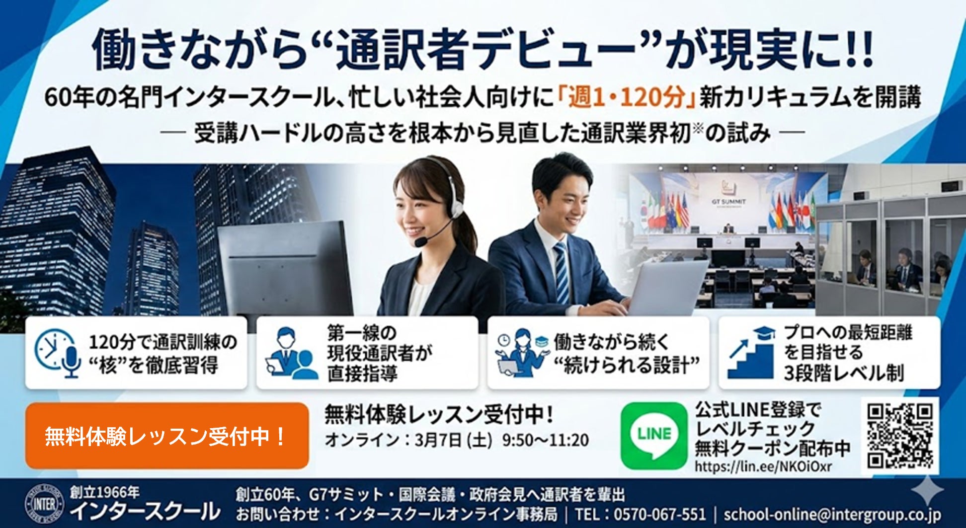 働きながら“通訳者デビュー”が現実に!!60年の名門インタースクール、忙しい社会人向けに「週1・120分」新カリキュラムを開講― 受講ハードルの高さを根本から見直した通訳業界初*の試み ―