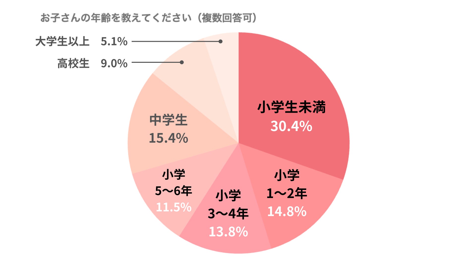 調査対象者の子供の年齢は、「小学生未満(30.4%)」が約3割、「小学1〜2年生(14.8%)」「小学3〜4年生(13.8%)」「小学5〜6年生(11.5%)」が合わせて約4割となりました。