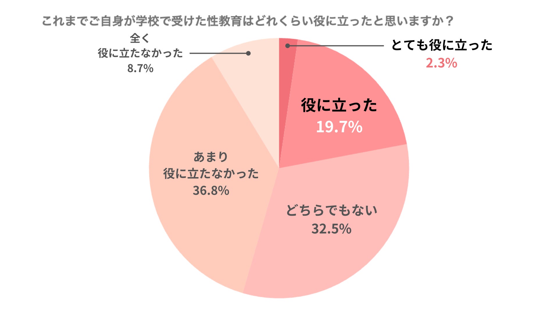 自分が学校で受けた性教育はどれくらい役に立ったかという設問では、「とても役に立った(2.3%)」「役に立った(19.7%)」と回答した割合が約2割。