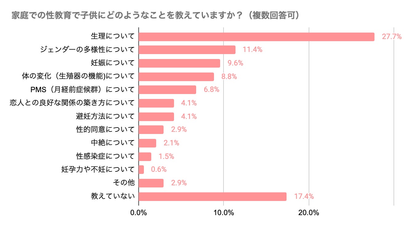 家庭での性教育の内容は「生理について(27.7%)」が最も多く、次いで「ジェンダーの多様性について(11.4%)」「妊娠について(9.6%)」が多い結果に。反対に、「妊孕力や不妊について(0.6%)」が最も少なく、次いで「性感染症について(1.5%)」「中絶について(2.1%)」が少ない結果に。