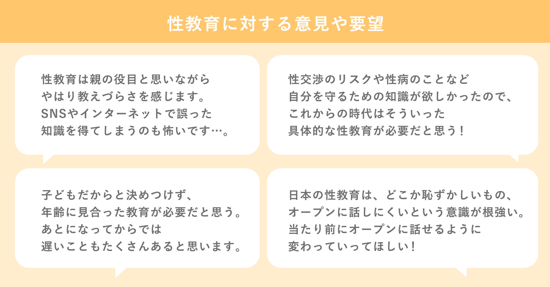 ・性交渉のリスクや性病のことなど自分を守るための知識が欲しかったので、これからの時代はそういった具体的な性教育が必要だと思う。