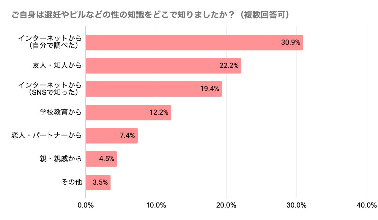 「ご自身は避妊やピルなどの性の知識をどこで知りましたか?」という設問では、「インターネットから(自分で調べた/30.9%)」が最も多く、「親・親戚から(4.5%)」が最も少ない結果に。