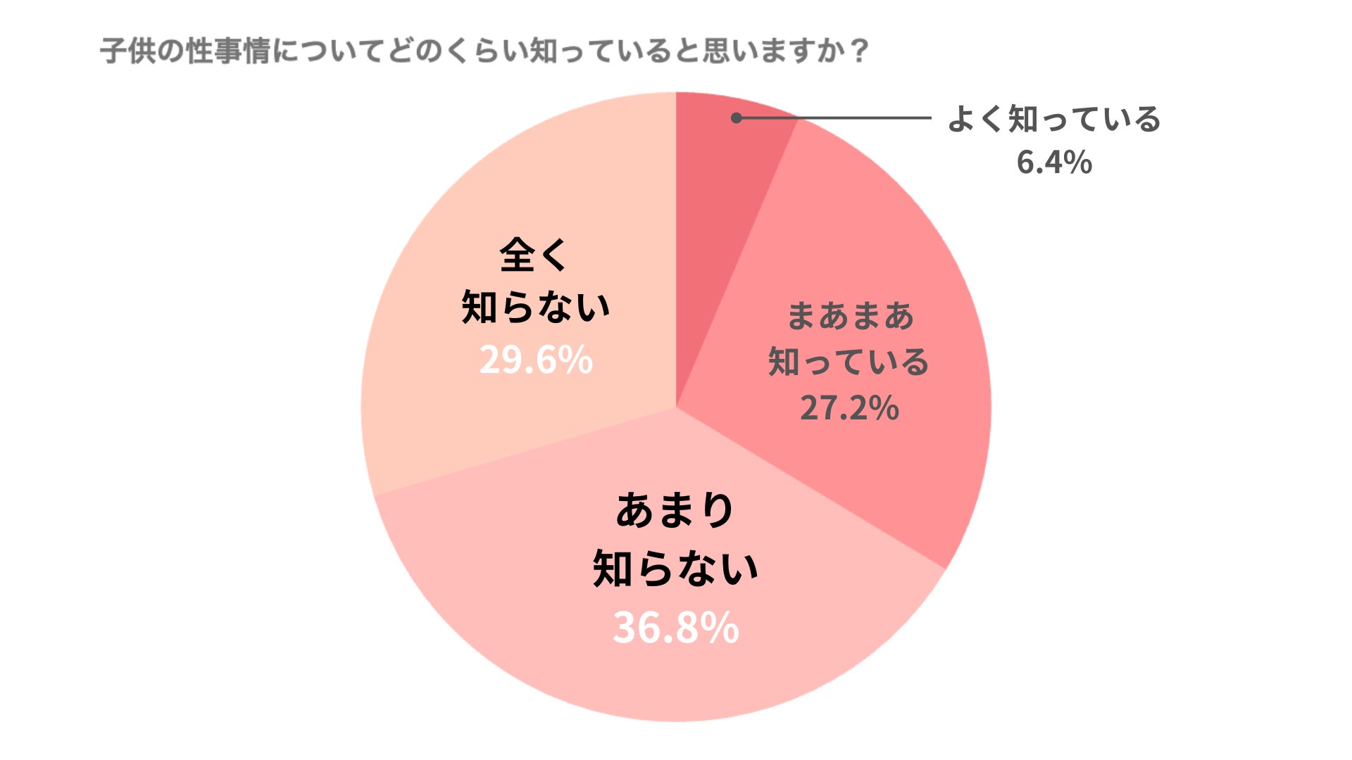 また、子供の性事情の認知度を問う質問では、「全く知らない(29.6%)」「あまり知らない(36.8%)」が65%以上となり、親子間で子供の性事情に関して話しずらさがあると考えられます。