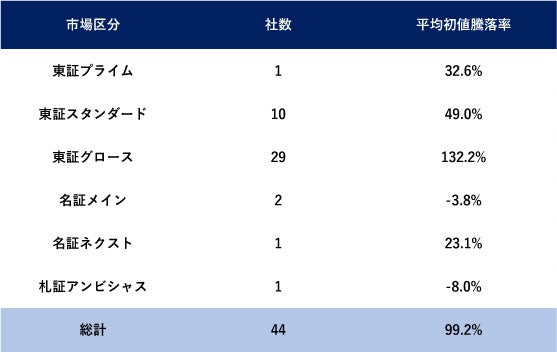 調査対象:期間内に国内の取引所(東京証券取引所、名古屋証券取引所、福岡証券取引所、札幌証券取引所)に新規上場した企業