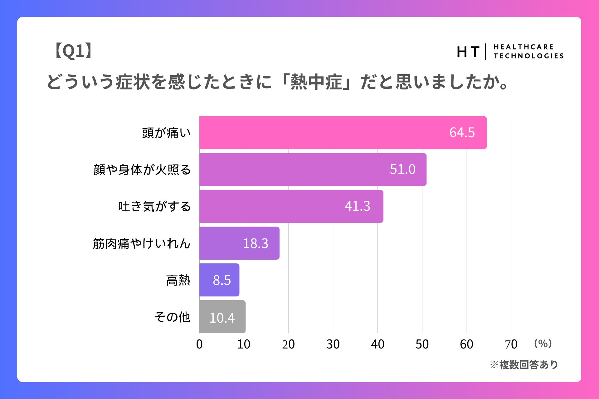 どういった症状を感じたときに熱中症を疑ったかという質問に対して、「頭が痛い」が64.5%、次いで「顔や身体が火照る」が51.0%、「吐き気がする」が41.3%という結果になりました。