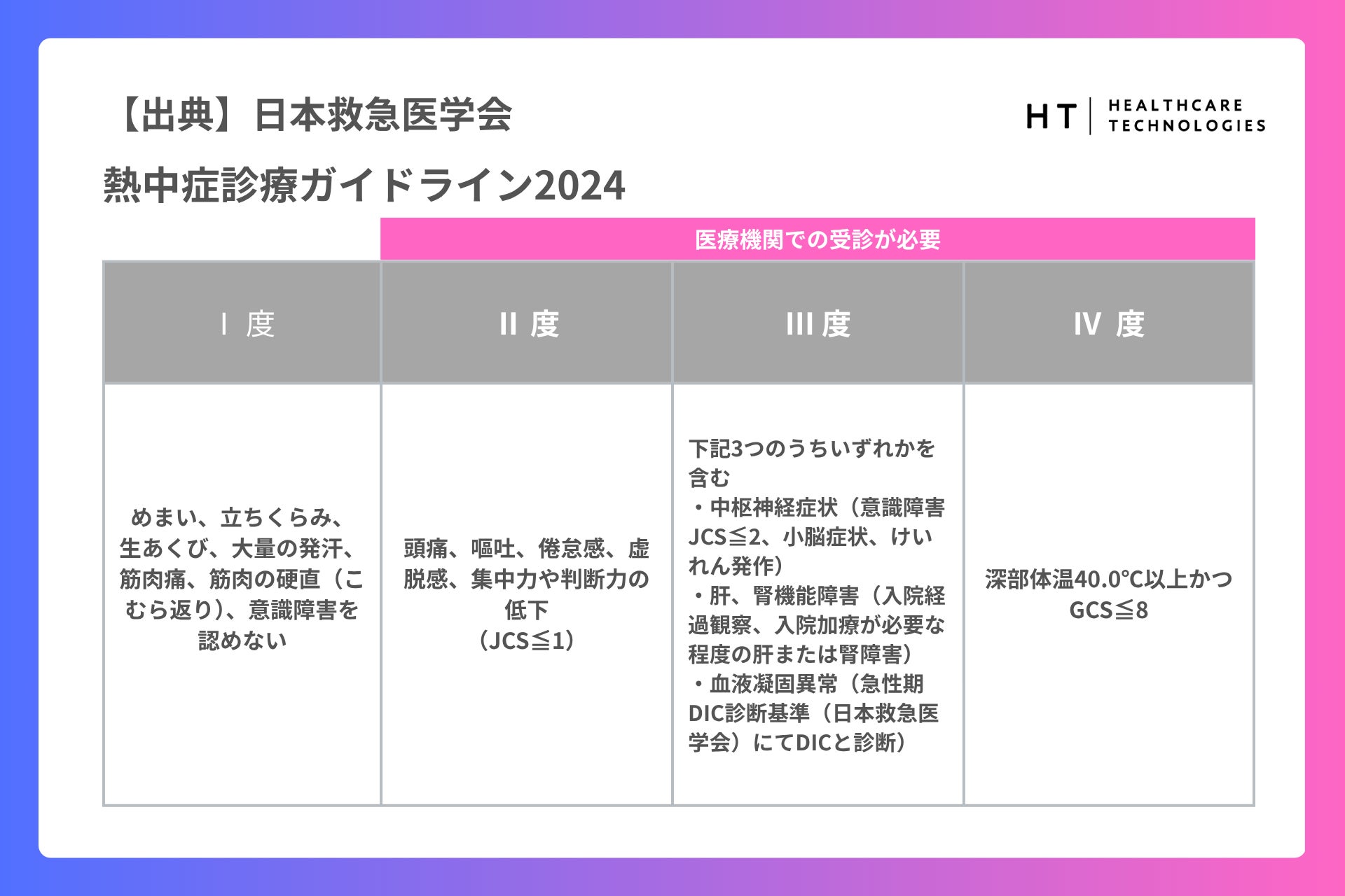 今回のアンケート調査では、特に「頭痛」や「吐き気・嘔吐」といった症状を感じて熱中症を疑う方が多く見られましたが、これらの症状は日本救急医学会が定める熱中症の重症度分類において、Ⅱ度に該当する注意すべき重要な兆候です。Ⅱ度は、気づかぬうちに重症化してしまう可能性があるため、速やかな医療機関の受診や医療者の判断が求められる状態です。