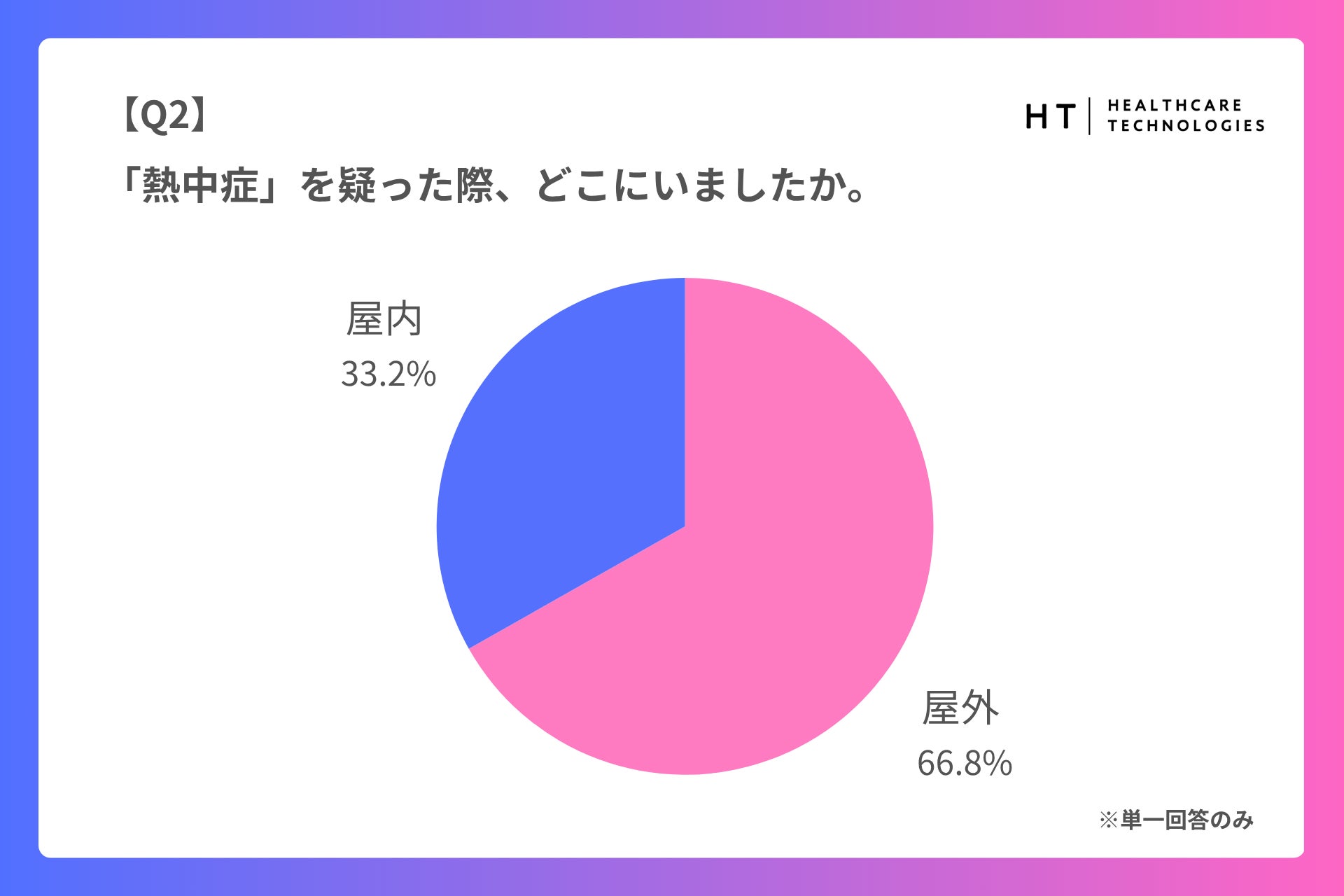 熱中症を疑った際にどこにいたのかという質問に関しては、66.8%が公園や道路などの「屋外」に対し、33.2%が「屋内」という回答でした。