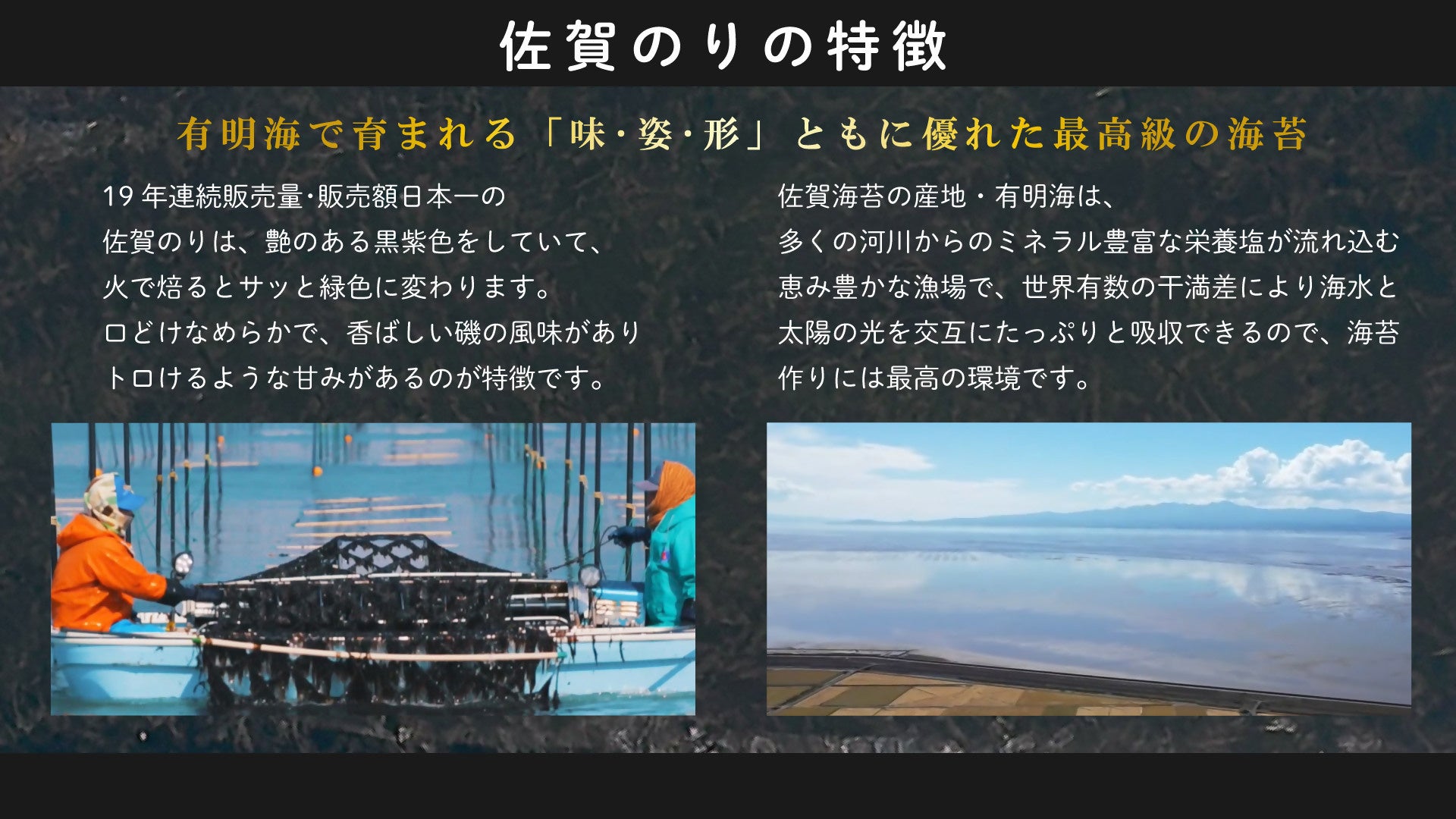 佐賀のりは、ミネラルを含んだ栄養豊富な有明海で育ち、柔らかな口どけと豊かな香り、甘みを含んだ独特の旨みが特徴です。