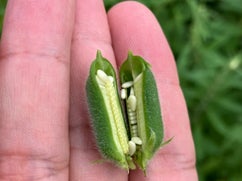 ごまの収穫時期は9月~10月頃。「さく果」とよばれるさやの中に、80〜100 粒ほどが詰まっています。