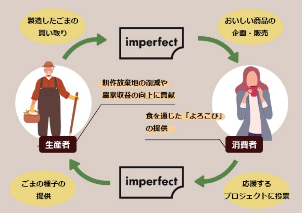imperfectは、さやが開かず機械で収穫できるごまの種子の活用した国産ごまの栽培を応援。ごまは乾燥にも強く、細かい水管理が不要であることから、収穫の手間を省くことで、生産負荷が大幅に削減されます。高齢化や労働力不足により維持が難しい耕作地を活用し、国産ごまの栽培を活性化するとともに、日本の農業の課題となる耕作放棄地の削減や農家の収益向上に貢献することを目指しています。