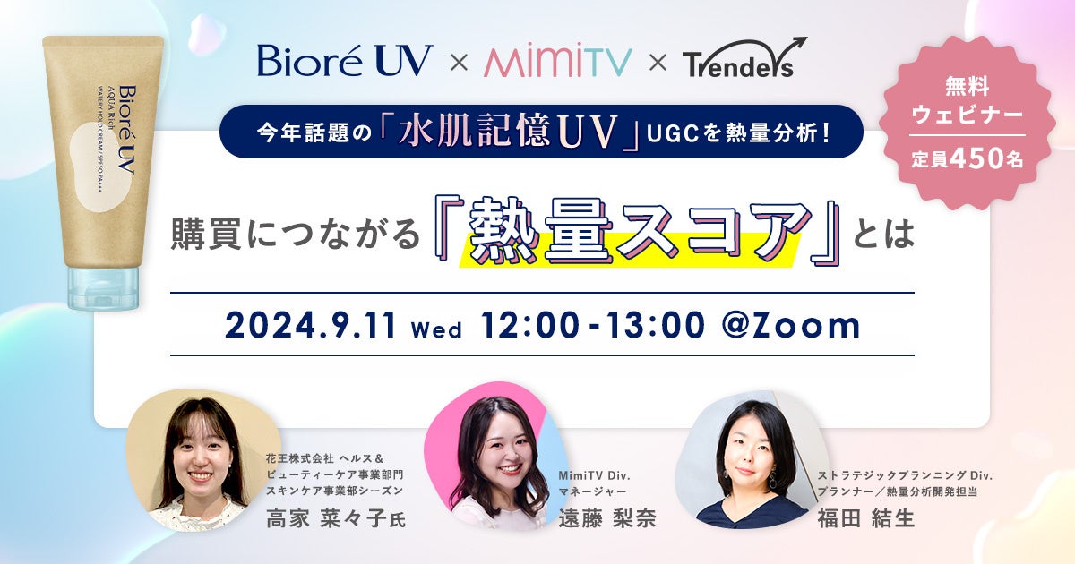 トレンダーズ株式会社(所在地:東京都渋谷区、代表取締役社長:黒川涼子、東証グロース上場:証券コード6069)が運営する美容メディア「MimiTV」は、無料マーケティングウェビナー「今年話題の『水肌記憶UV』UGCを熱量分析!購買につながる『熱量スコア』とは」を、2024年9月11日(水)に開催いたします。