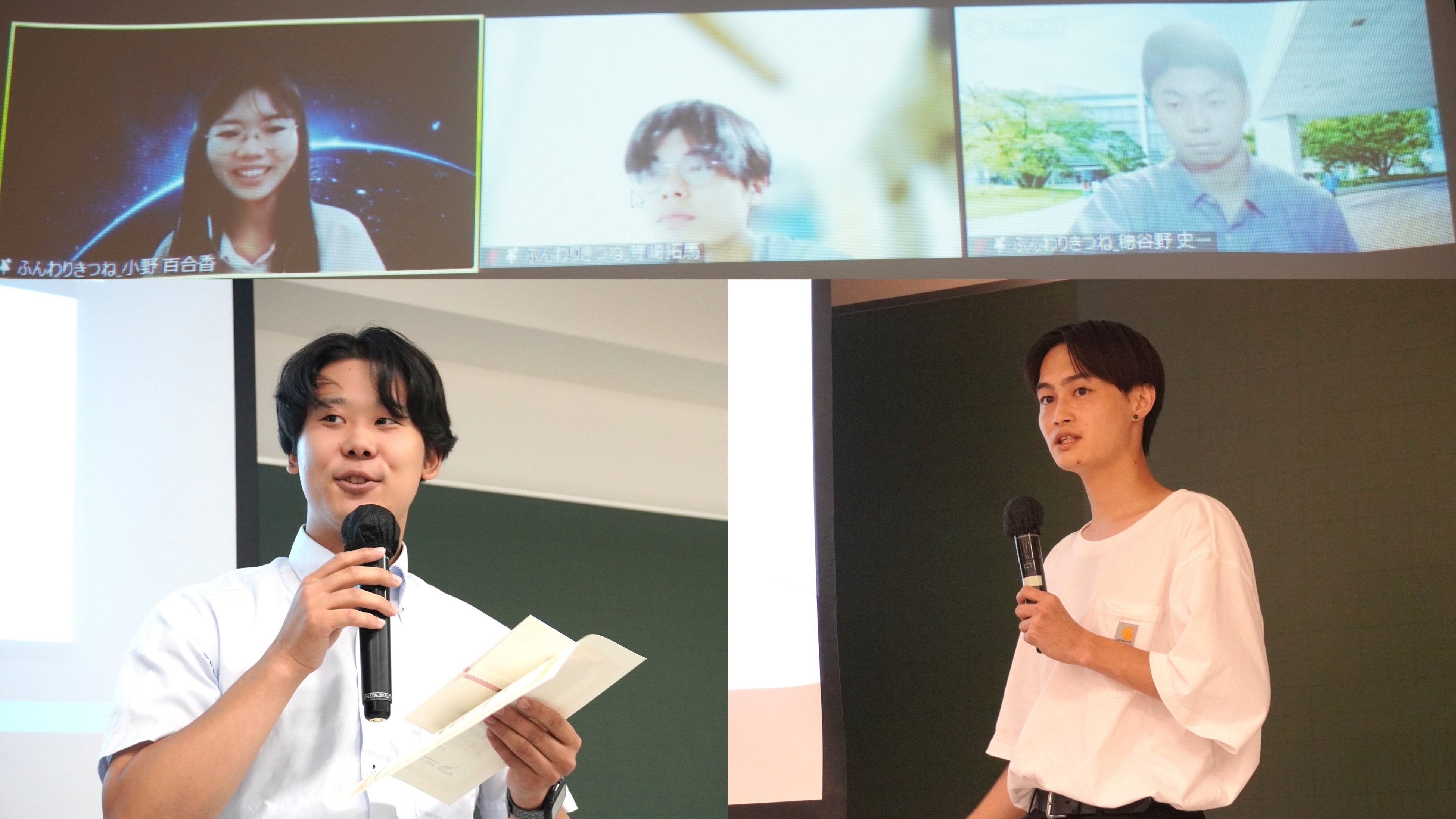 オンライン参加し、スクリーンに映し出された優勝チーム「ふんわりきつね」(東京理科大学)