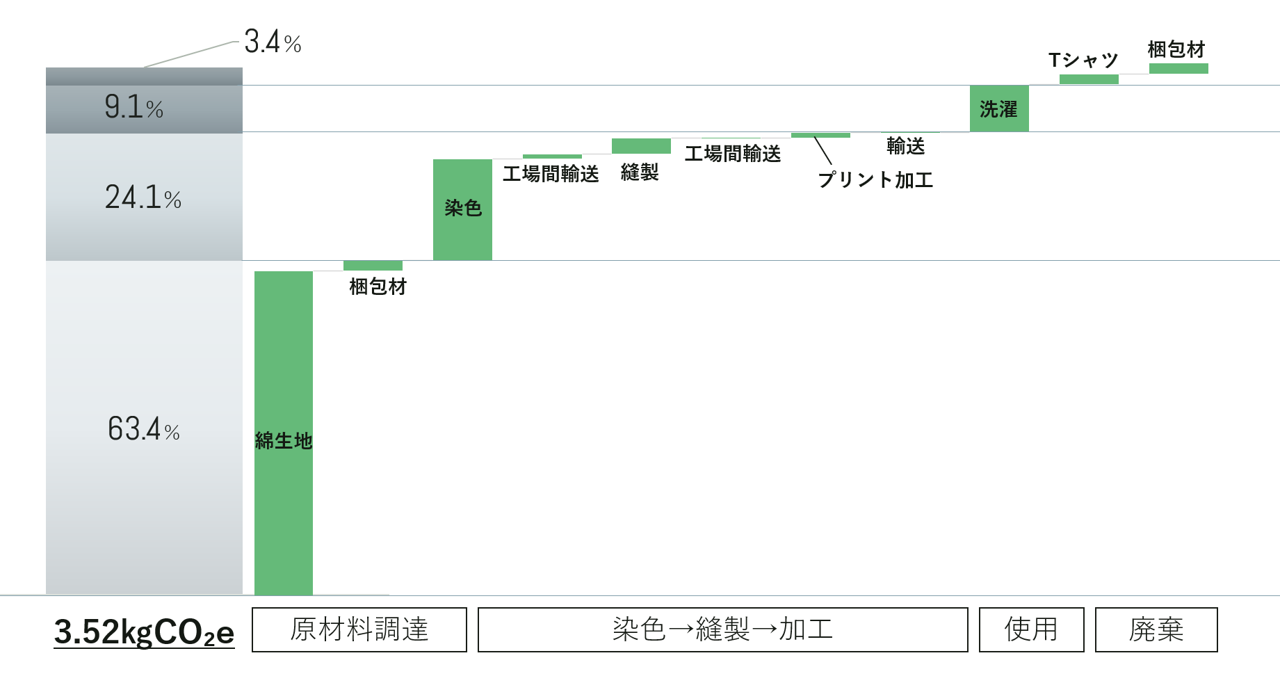 当該商品の「原材料調達」「生産(染色、縫製、加工およびその間の輸送)」「使用」「廃棄」の過程における、全体のCO2排出量は3.52㎏CO₂eでした。