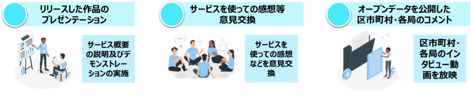 ・出席者コメント ・オープンデータを公開した区市町村・各局のインタビュー動画放映 |