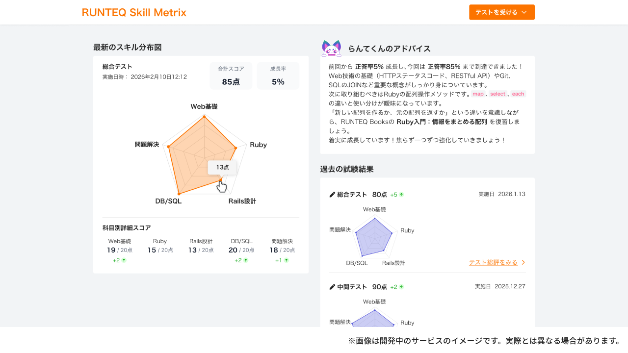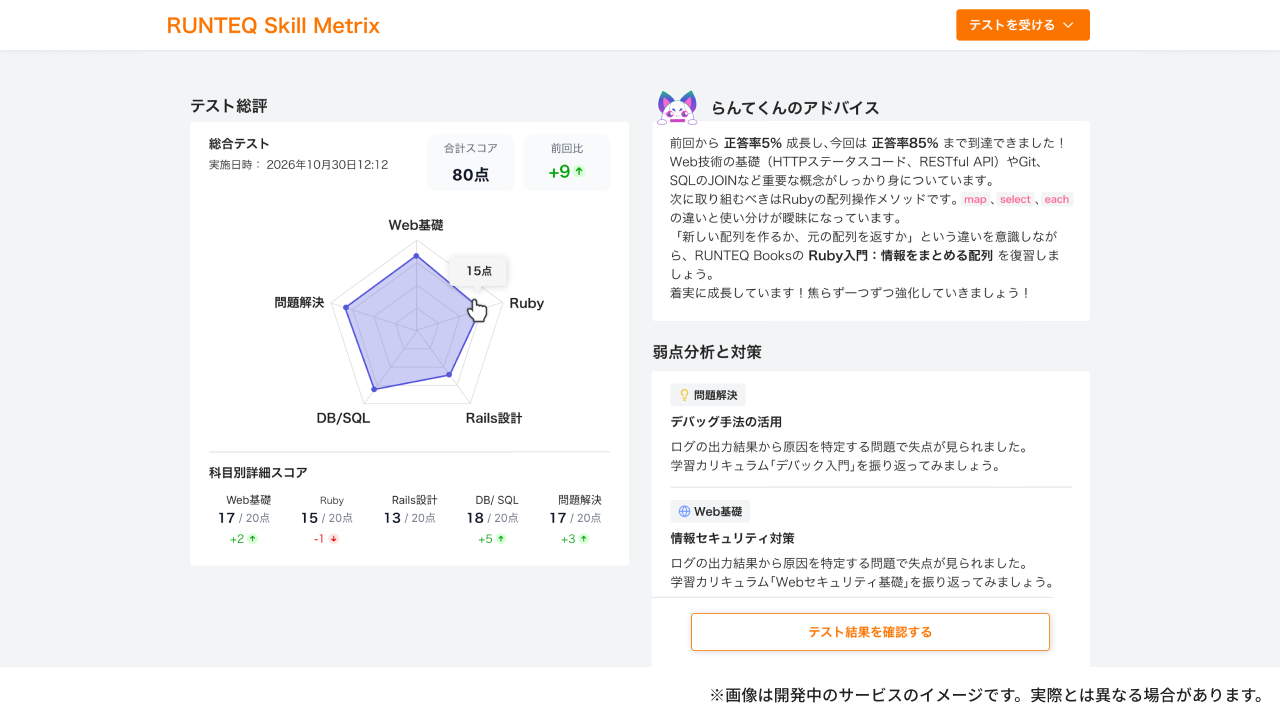 Skill Metrixは、Webエンジニアに求められる知識・理解・思考力を定量的に測定し、レーダーチャートで可視化するRUNTEQオリジナルのオンラインテストです。