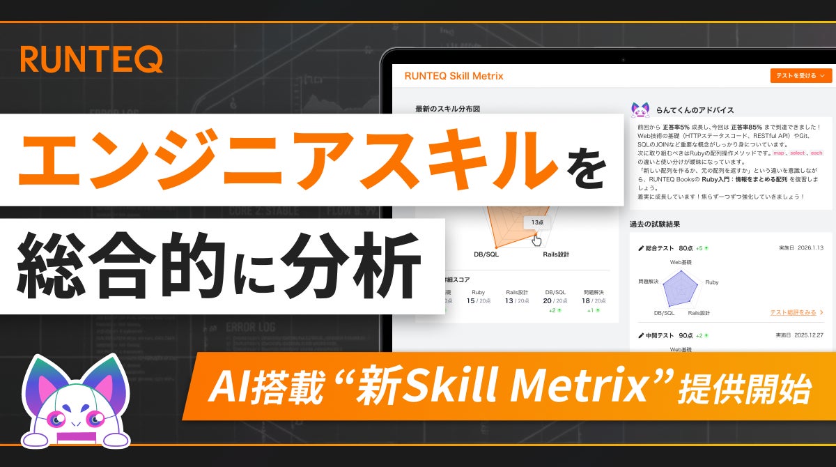 株式会社RUNTEQ(東京都渋谷区、代表取締役社長 兼 CTO:菊本 久寿)は、プログラミング学習者向けスキル評価サービス 「Skill Metrix(スキルメトリクス)」を全面リニューアルし、本日より提供を開始いたしました。