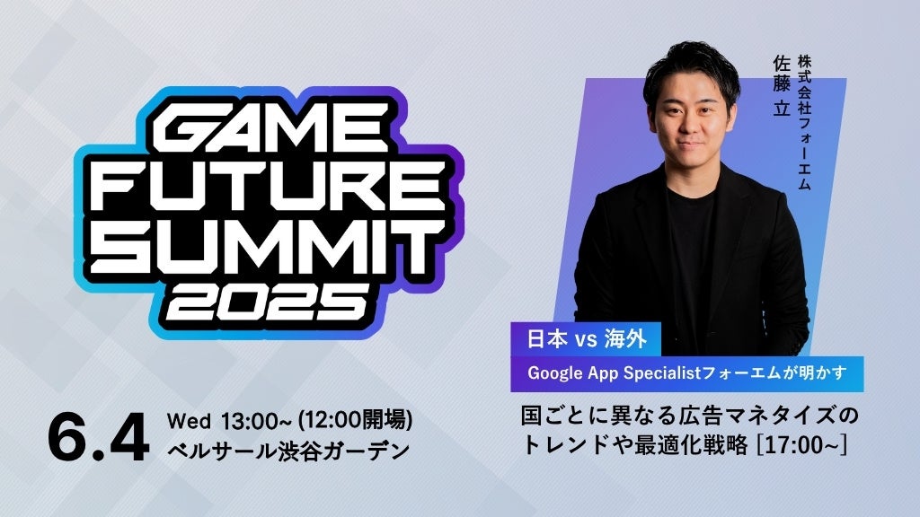 2025年6月4日(水)開催 ゲーム業界最大級のビジネスカンファレンス「GAME FUTURE SUMMIT 2025」に登壇!フォーエムとGoogleが、海外展開時の国選定方法や収益化戦略を徹底解説