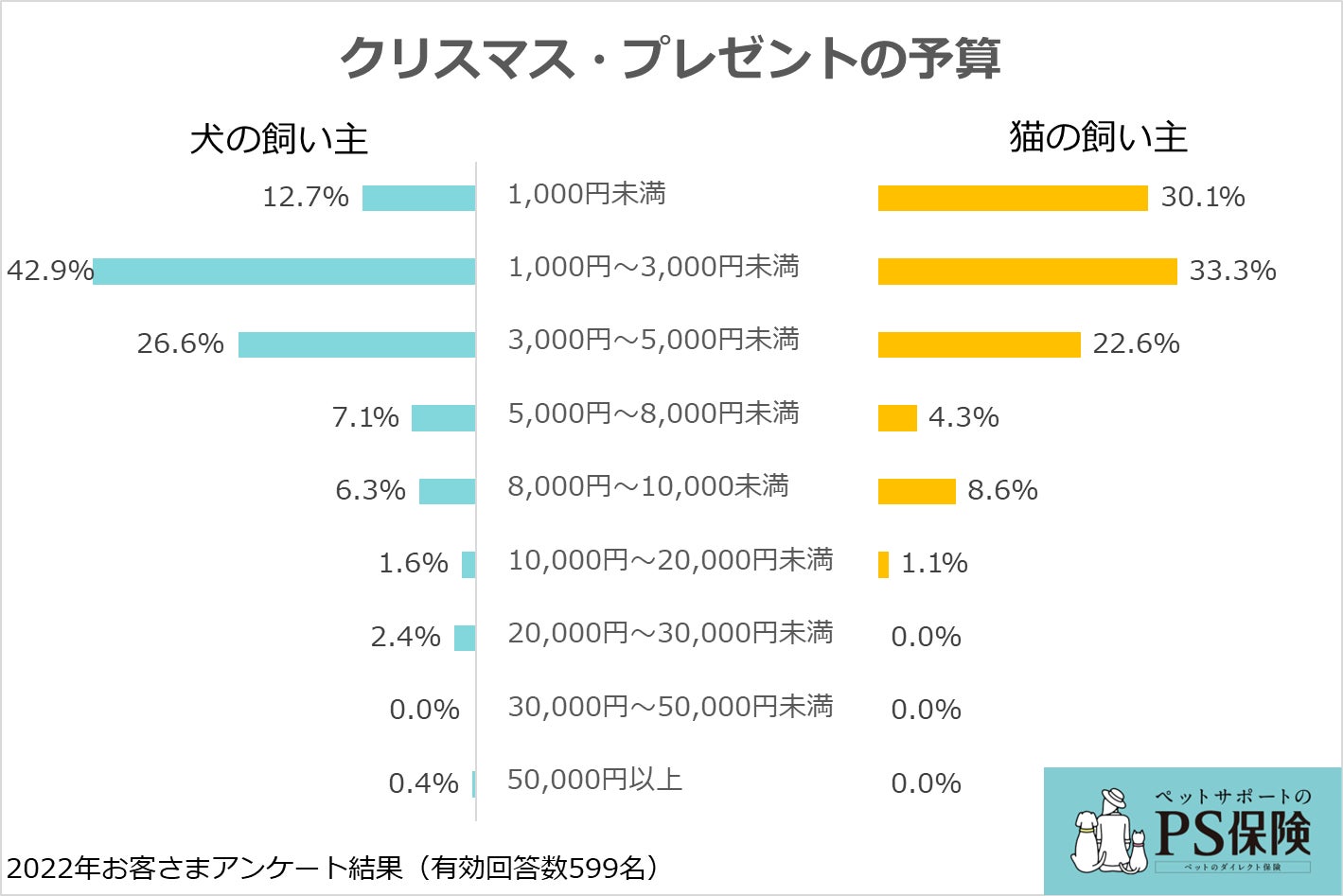 プレゼントの予算は、犬猫共に1,000円~3,000円未満が最多。中には5万円以上も!
