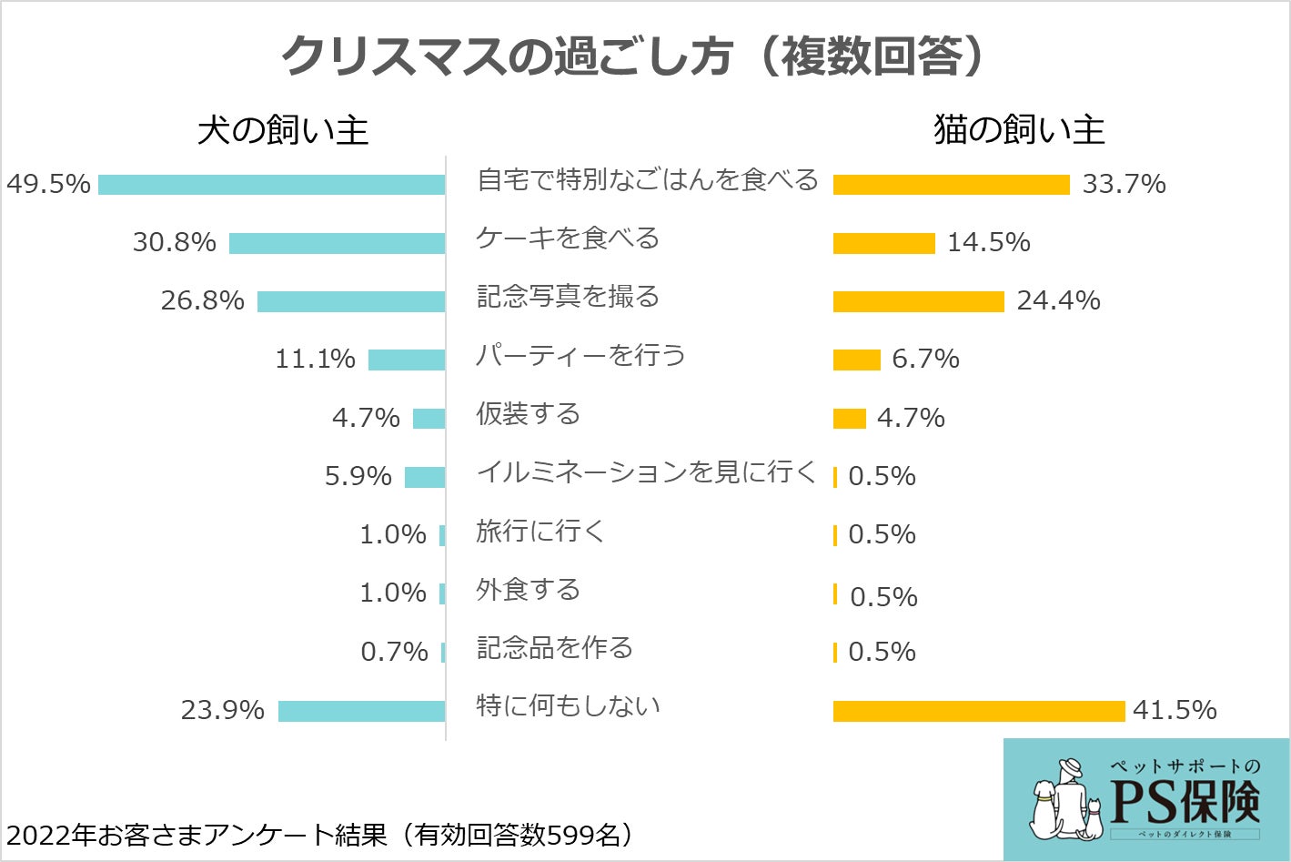 ペットとのクリスマスの過ごし方について、最も回答率が高かったのは、犬の飼い主の場合、「自宅で特別なごはんを食べる」(49.5%)、猫の飼い主の場合、「特に何もしない」(41.5%)と極端な結果となりました。