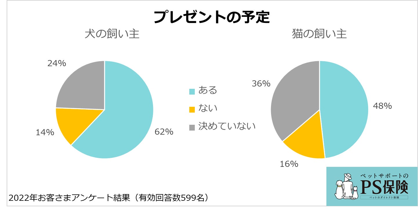 ペットにプレゼントを贈る予定を聞いたところ、犬猫共に「ある」が最も多いものの、犬の飼い主の場合は62%、猫の飼い主の場合は半数に満たない48%と、その差にやや開きがあります。