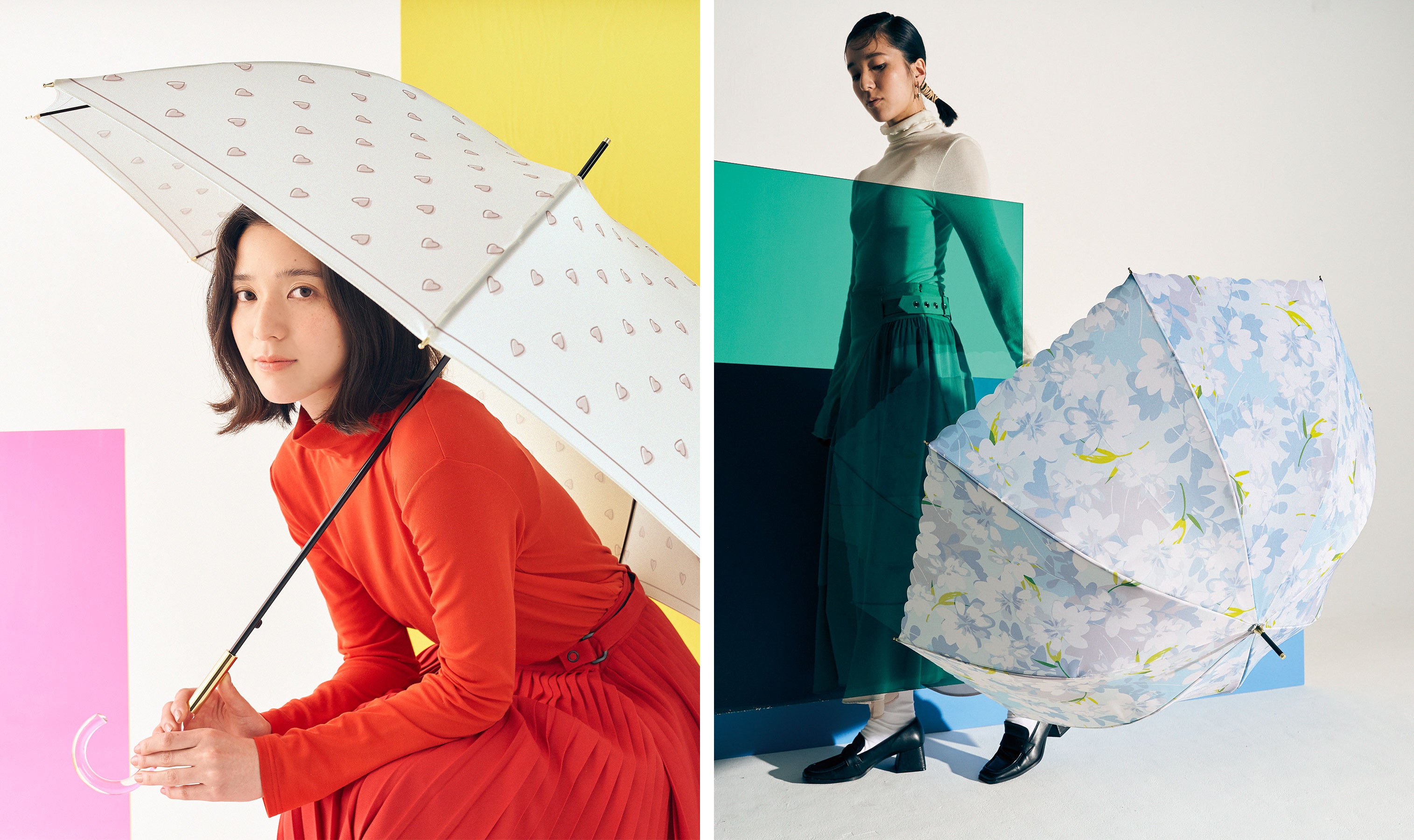 フルーツやお花をストライプと組み合わせた華やかな「オーチャードストライプ」、韓国雑貨のような手書き風のハートに透明のクリアハンドルを合わせて甘さを抑えた「チャーミーハート」、織物のような風合いに花柄をのせて秋らしさを演出した「フラワーウィービング」など新作雨傘6柄が登場。長傘はワンタッチで開くジャンプ式です。