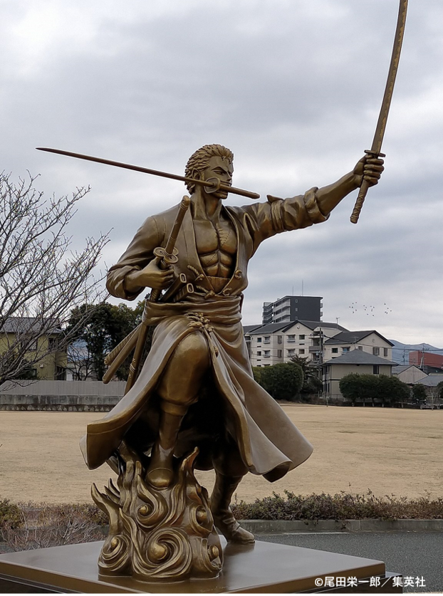 「ヒノ国」復興編として、県内市町村に麦わらの一味の仲間の像の設置プロジェクトが進んでいます。これまでに、ルフィをはじめ、サンジ、ウソップ、チョッパー、ブルック、フランキー、ナミ、ロビン像が設置され、9体目となる剣士ゾロの像がついに1月22日(土)にお披露目されました。熊本地震の被害によって、「ヒノ国」の住民が苦しんでいることを知った仲間たちは、復興へのエールを送るルフィのもとでの再会を誓い、それぞれの特技を活かして被災地の復興の手助けをしています。
