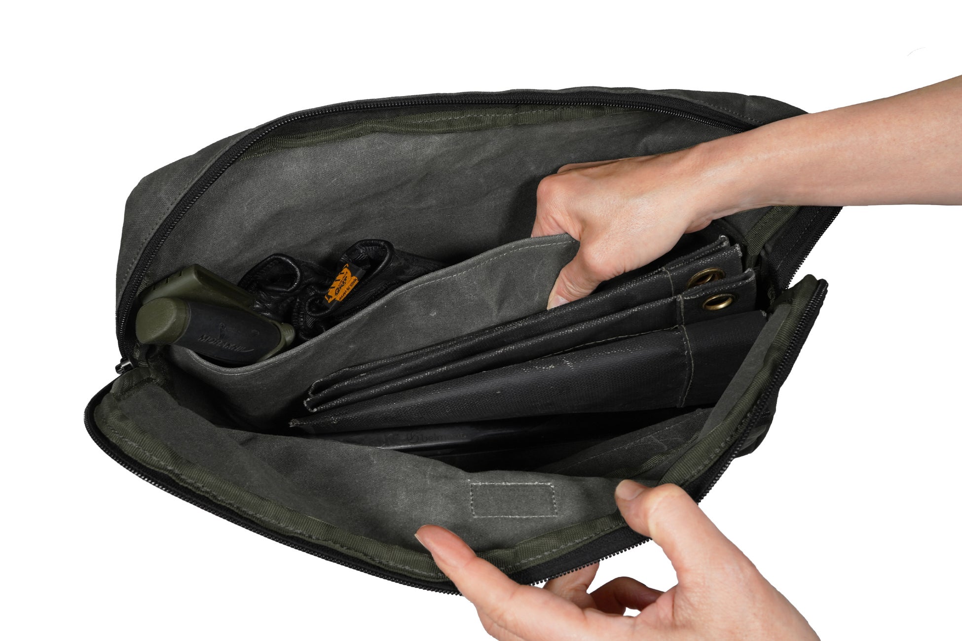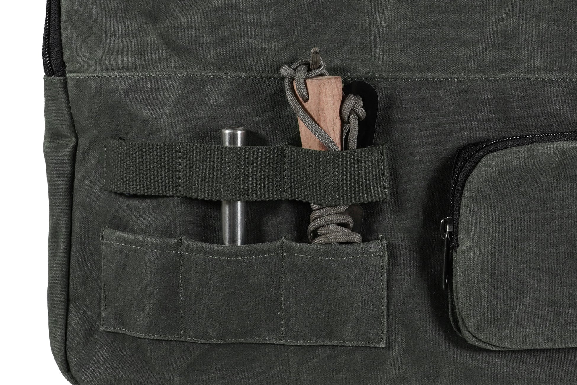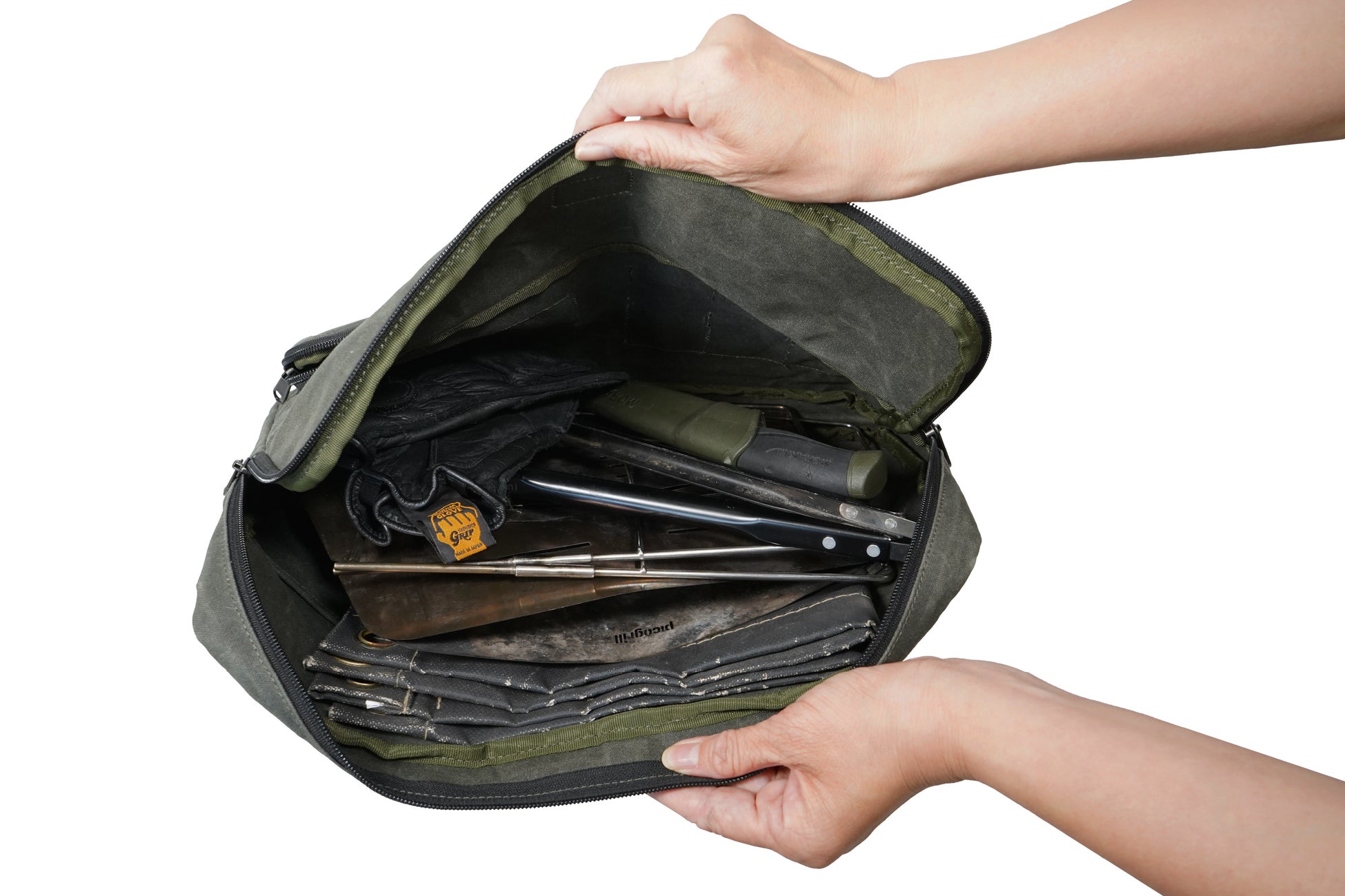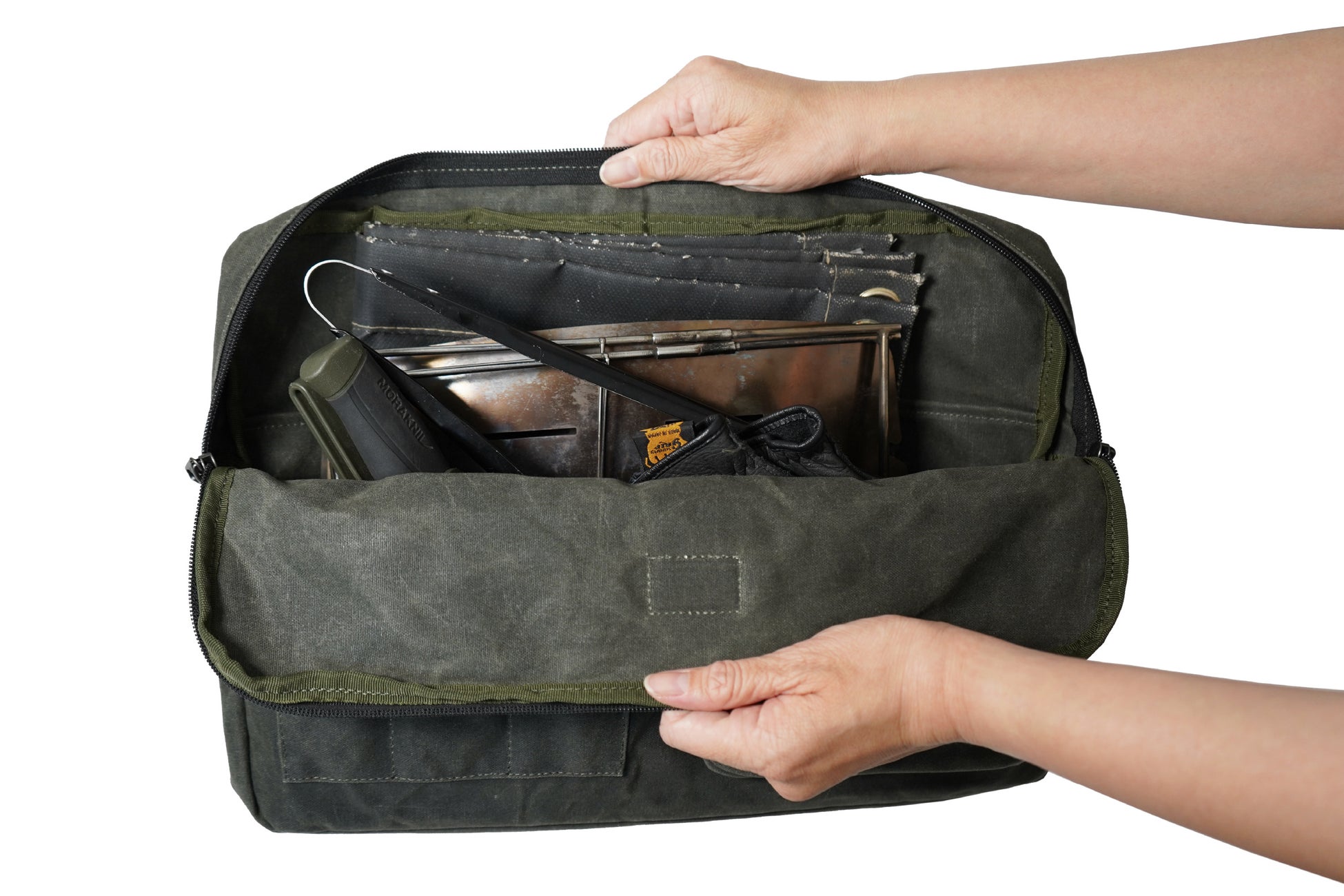 そのイラストをベースにサンプルを製作。ケース全体のサイズ、フロントポケットのサイズ、フロントループの仕様、ハンドルの有無などユーザーのフィードバックを受けながら改良を重ね、「焚き火ストレージ&キャリー」は完成しました。