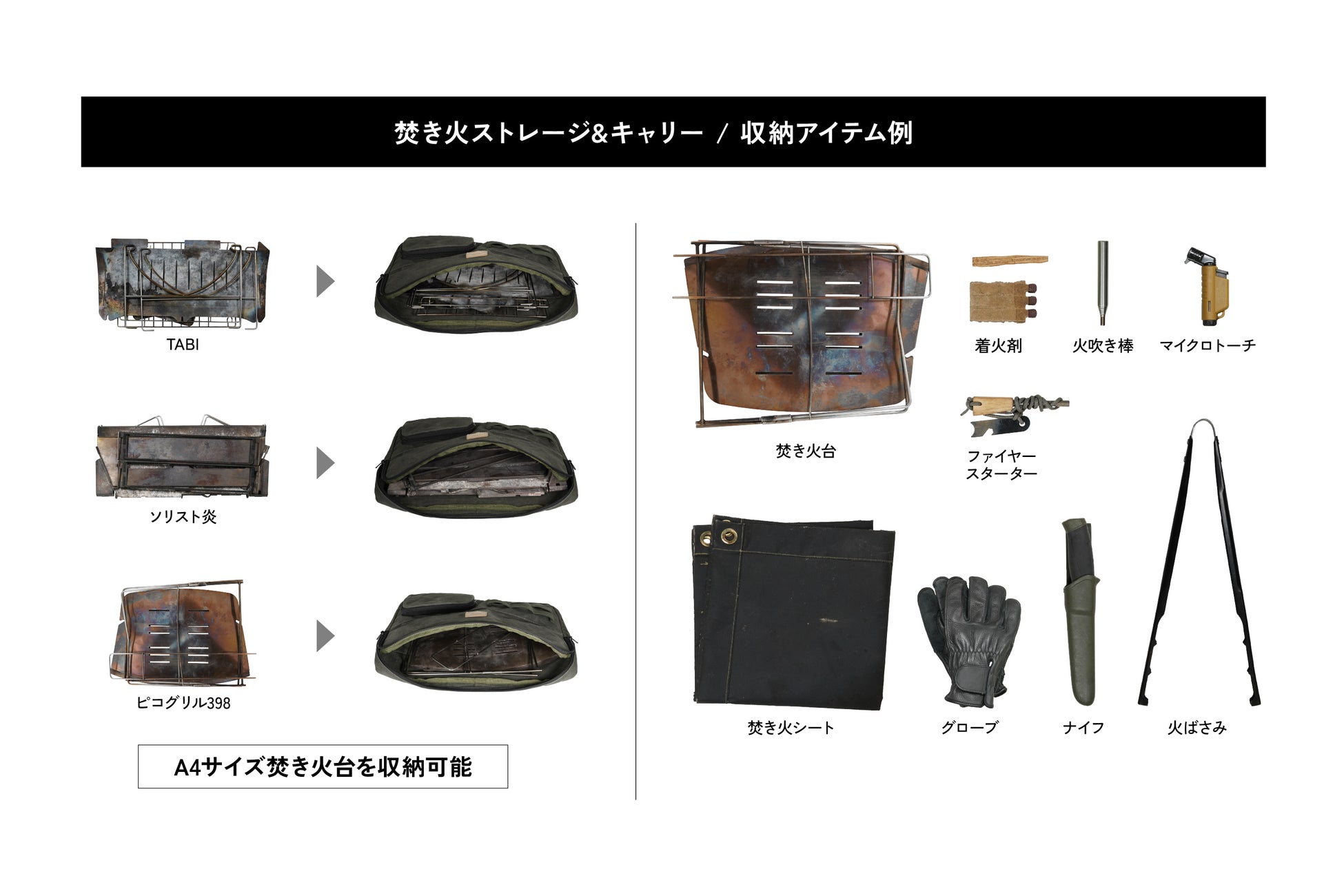 焚き火ストレージ&キャリーのコンセプトは「焚き火に必要な道具を一つにまとめる」。