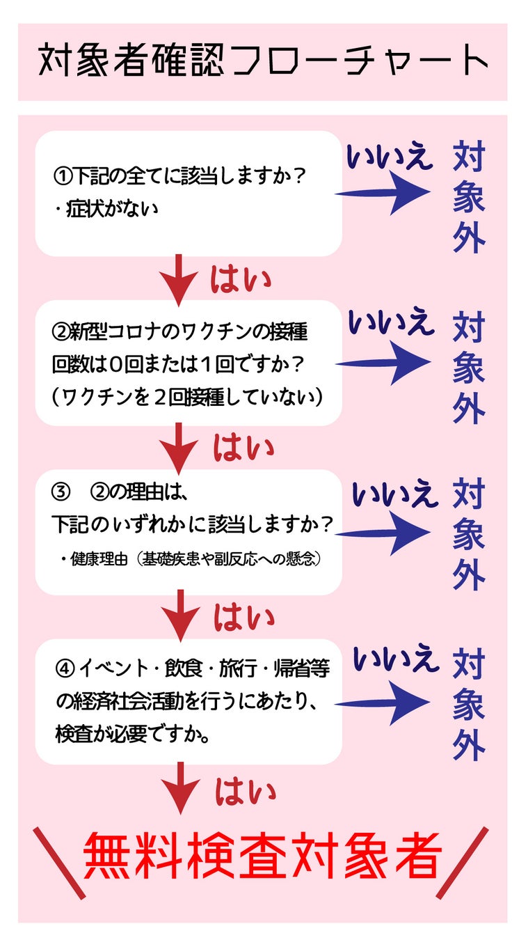 ※ワクチンを2回接種済みの方や、自らの意思でワクチンを接種されなかった方の検査は無料ではありません。