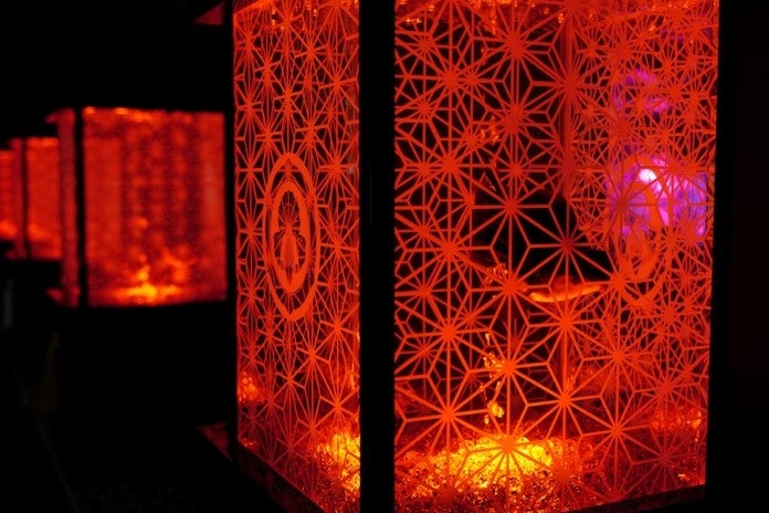 金魚が泳ぐ水槽作品を光と香り、そして音楽で演出するアートアクアリウム。当館では各作品エリアを、作曲家・コーニッシュ氏に制作していただいたオリジナル楽曲で演出しています。
