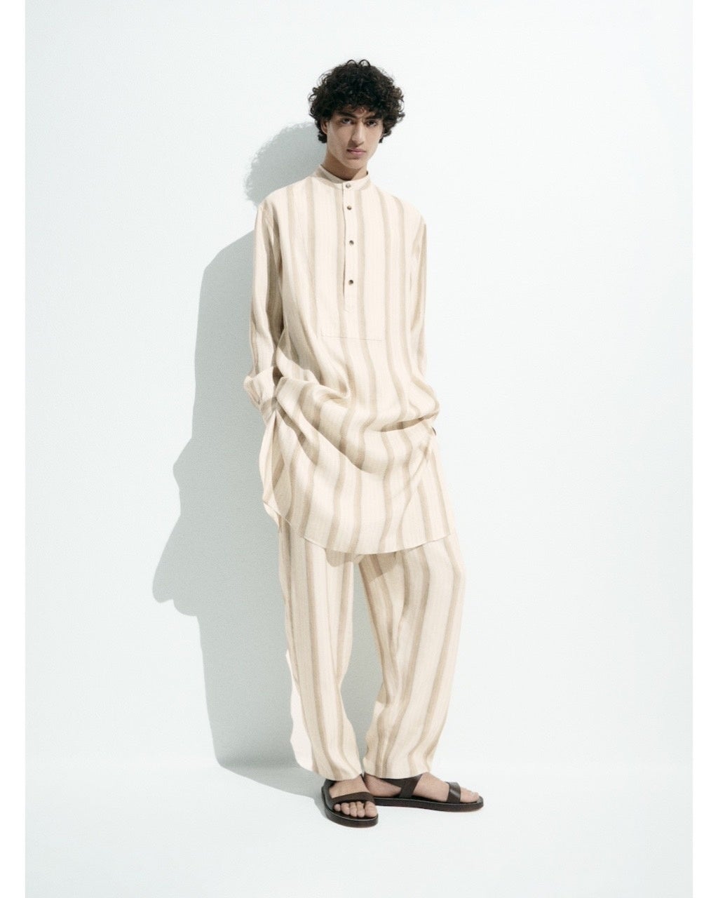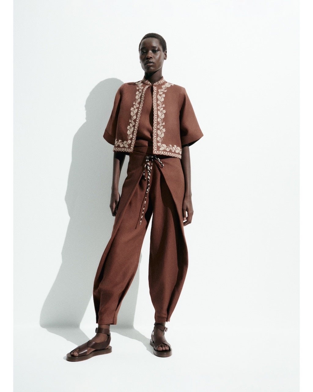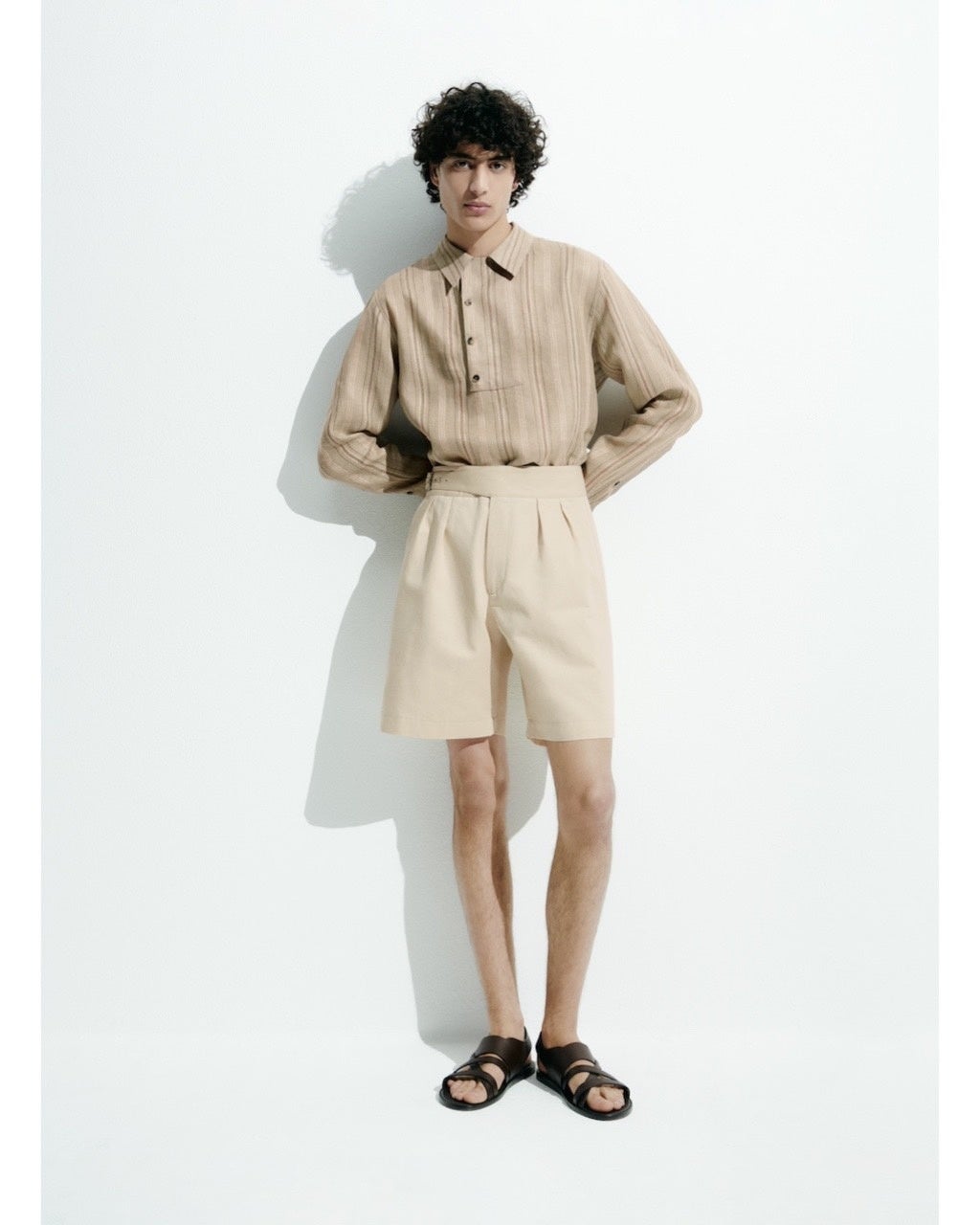 ボリュームがありゆったりした多彩なワードローブが展開されます。メンズはバミューダ、カフタン、風合いのある織りのオーバーシャツ、レディスはワイドパンツ、ラップスカート、着物袖のクロップドTシャツ、アロエ繊維とカシミヤの糸で刺繍が施されたベストやショーツなどが揃います。
