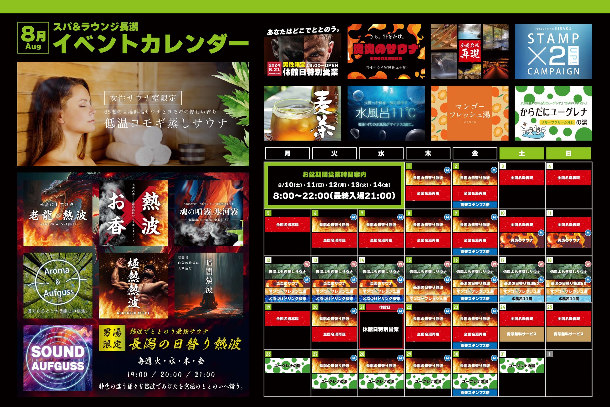 月間来場者数15,000人を超えるサウナ施設『スパ&ラウンジ長潟(新潟市中央区)』は、2024年8月12日(月)~8月19日(日)まで、女性サウナ限定で新イベント「低温ヨモギサウナ」を開催いたします。