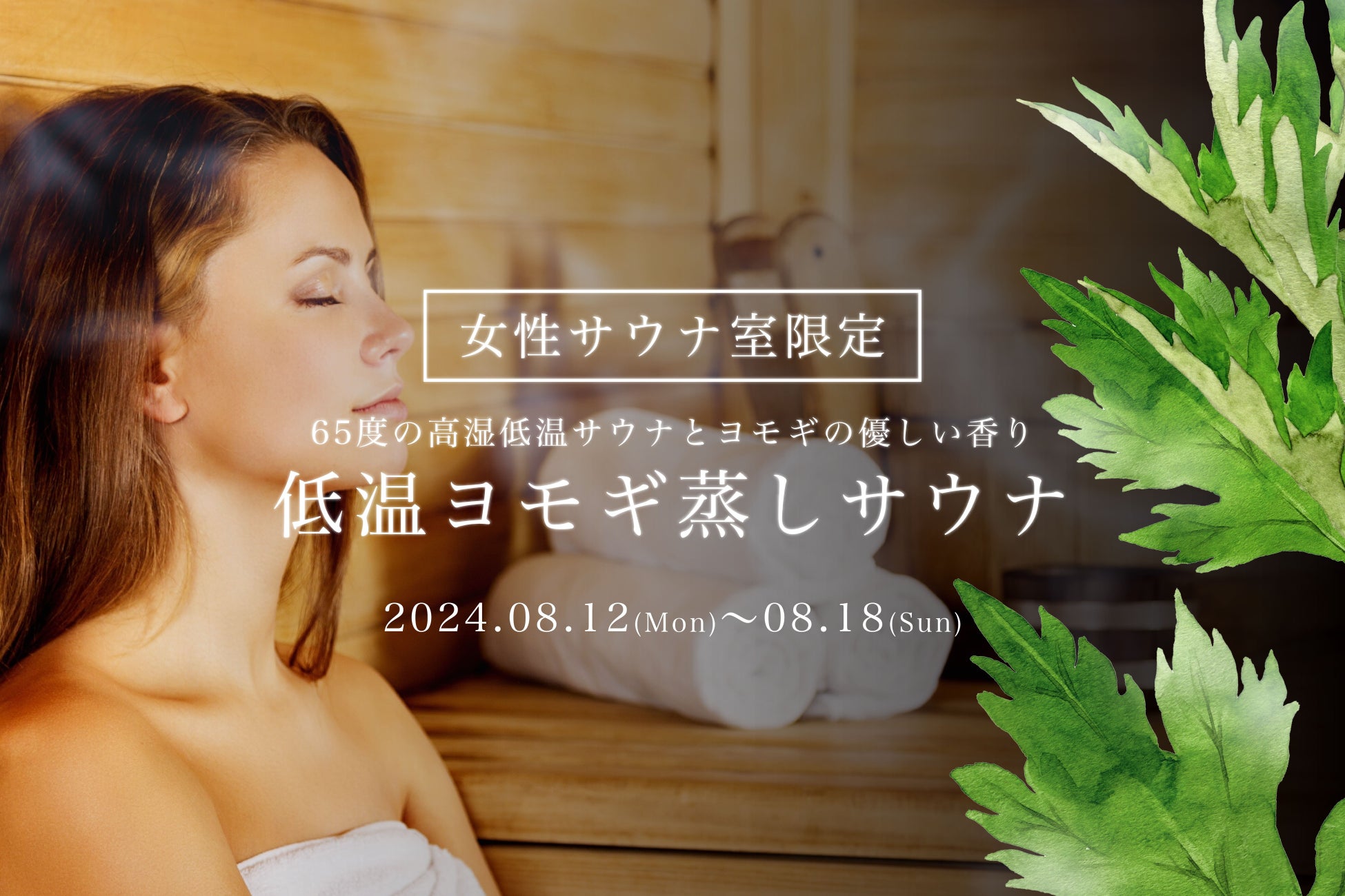 【スパ&ラウンジ長潟】女性限定イベント『低温ヨモギサウナ』開催決定!当館自慢の遠赤外線ドライサウナ、独自開発による高多湿の超発汗、さらにはヨモギの香りで驚異の心地よさを実感!