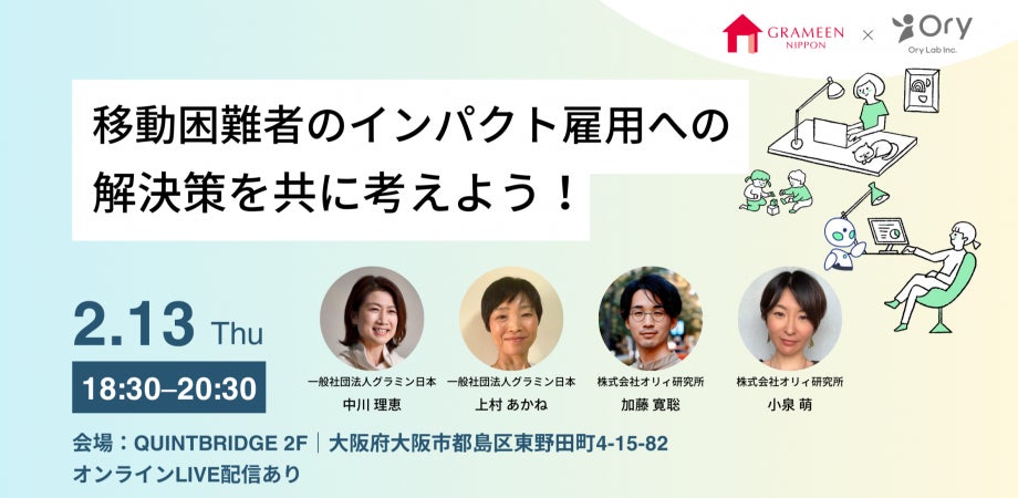 一般社団法人グラミン日本は、“コミュニケーションテクノロジーで人類の孤独を解消する”を掲げる株式会社オリィ研究所と共催で、2025年2月13日(木)QUINTBRIDGE(大阪府大阪市)にて『移動困難者のインパクト雇用の解決策を共に考えよう!』を開催します。