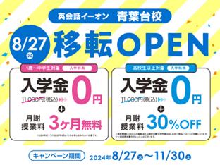 オープンにあたり「英会話体験無料特別イベント」及び「移転オープンキャンペーン」を実施いたします。