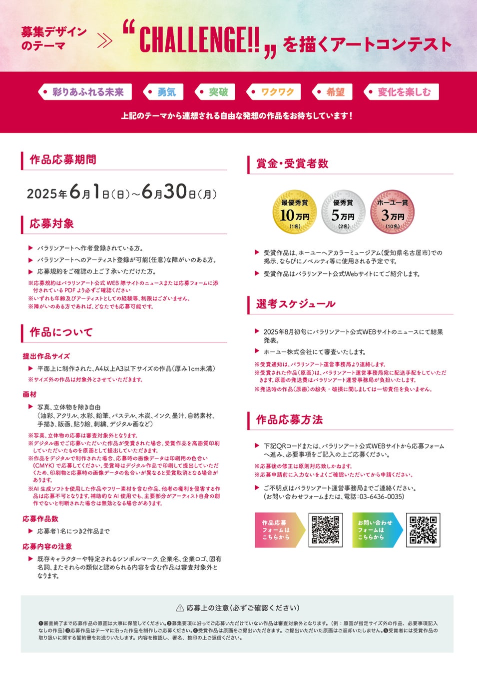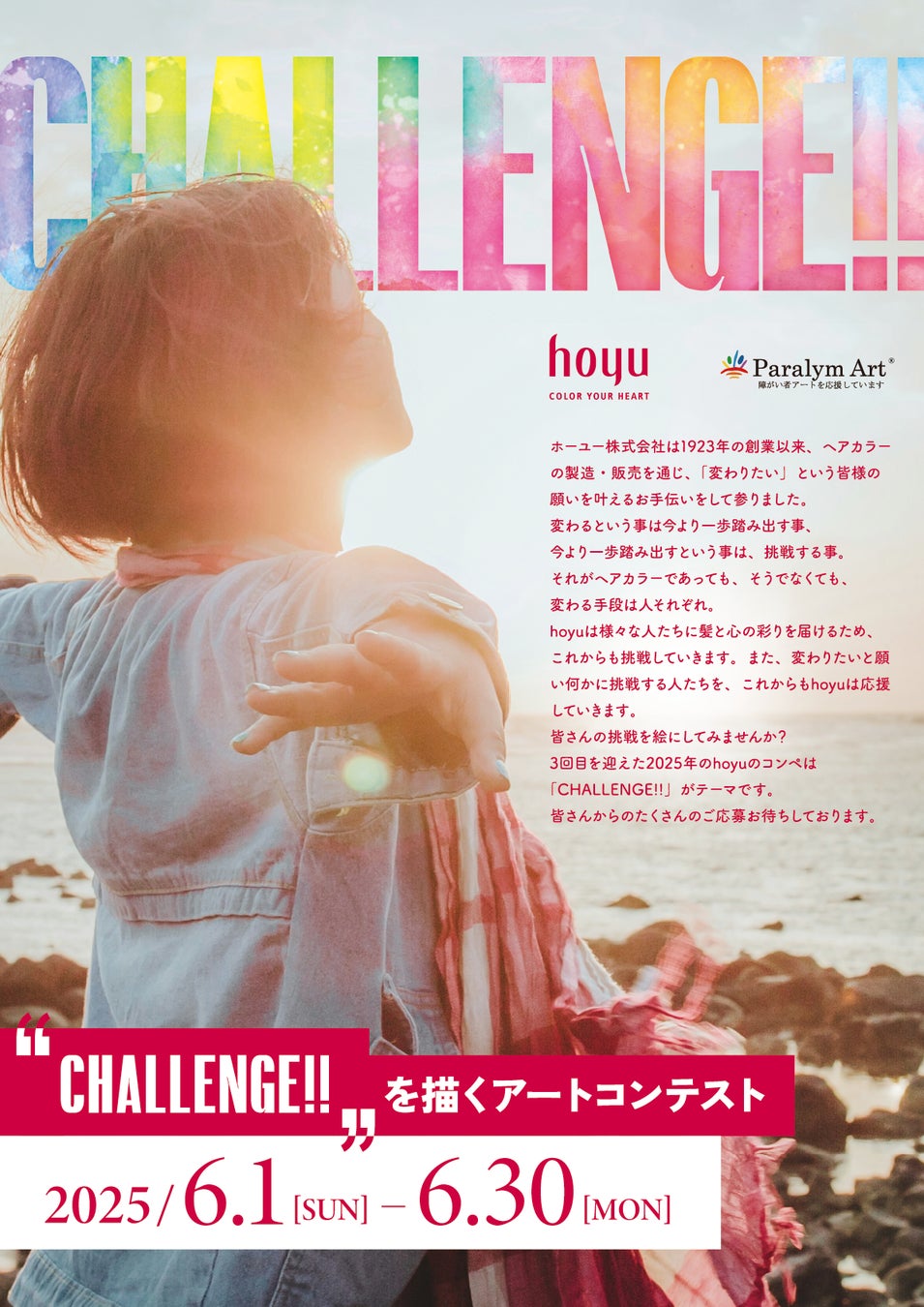 ホーユー株式会社とパラリンアートは、障がい者を対象にした「CHALLENGE!!」を描くアートコンテストを開催します。